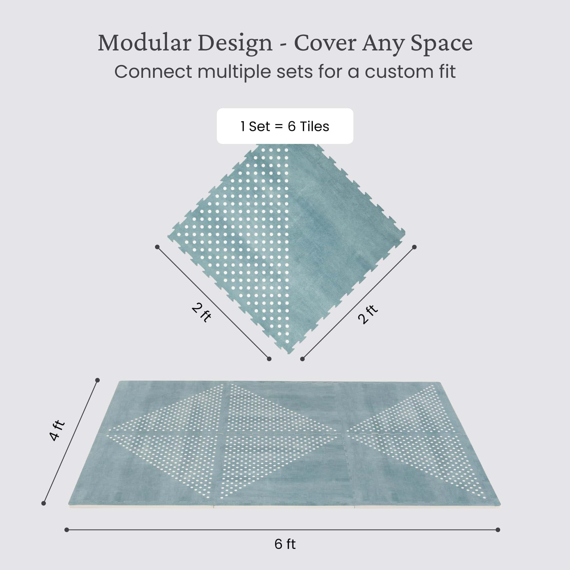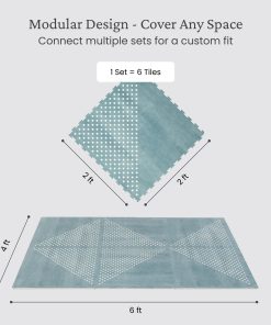 1. Tamaño Personalizable: Nuestro paquete estándar incluye 6 baldosas, cada una de 4 x 6 pies. Crea tu área de juego deseada comprando varios sets.