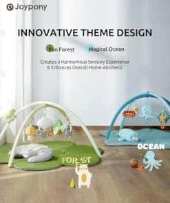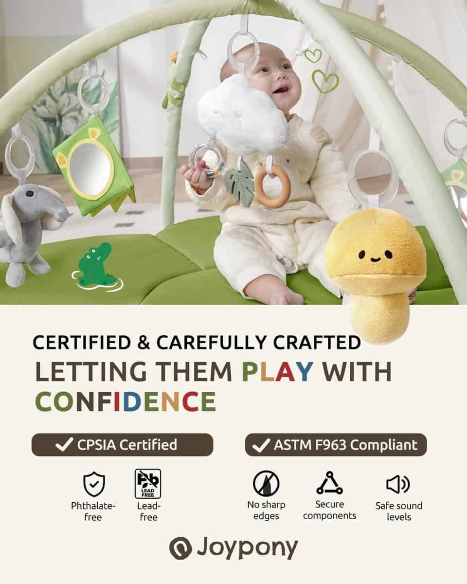 1. Diseño de tema de animales del bosque con elementos suaves como elefantes, camaleones, setas y nubes. El gimnasio para bebés Joypony introduce a los pequeños a las maravillas de la naturaleza mientras juegan. 2. Área de actividad espaciosa con un diámetro de 43.3 pulgadas, el gimnasio para bebés ofrece alrededor de 13.02 pies cuadrados de espacio de juego, dando a los bebés la libertad para rodar, gatear o sentarse sin restricciones. La barra de soporte arqueada ofrece 19.7 pulgadas de espacio vertical arriba, asegurando que no esté demasiado cerca de la cabeza del bebé para mayor seguridad durante la exploración. Este diseño permite a los bebés disfrutar de un amplio espacio de juego en casa, fomentando un espacio seguro para su crecimiento y descubrimiento. 3. Material suave y acolchado hecho con tela de terciopelo de piel de melocotón, el tapete de actividades para bebés es ultra suave y amigable con la piel, brindando un cuidado suave para la delicada piel de los bebés. Relleno de algodón de alta densidad, ofrece un acolchado cómodo y durabilidad, ayudando a suavizar el impacto del suelo. Los bebés pueden sentarse, gatear o jugar en este tapete, sintiendo el soporte acogedor debajo de ellos, permitiendo a los padres relajarse, sabiendo que su pequeño está en un ambiente seguro y cómodo. 4. Cojín grande para tiempos de panza Este cojín para tiempos de panza de tamaño generoso (15 11 5 pulgadas, por el lado más largo) brinda soporte adicional a los bebés durante el tiempo de panza, lo que lo hace más cómodo para que jueguen boca abajo. Esta posición ayuda a fortalecer los músculos del cuello y la espalda, construyendo una base sólida para futuros gateos y estar de pie. El material suave y el diseño pensativo del cojín crean una sensación de calidez y seguridad para los bebés, mejorando su comodidad durante el uso. 5. Set de juguetes educativos multisensoriales Este gimnasio para bebés incluye una variedad de juguetes colgantes atractivos, como un juguete de arrastre de camaleón, seta, juguete de elefante arrugado y mordedor de nube. Estos juguetes están diseñados para estimular el desarrollo sensorial de los bebés, ofreciendo experiencias táctiles y visuales. La interacción con estos juguetes promueve la coordinación mano-ojo y las habilidades cognitivas, sentando las bases para el desarrollo intelectual temprano.