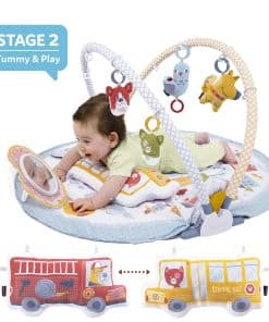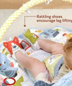 Nueva y emocionante versión urbana de nuestro producto más vendido, premiado como el ganador del Producto Favorito de los Padres 2018 por Tillywig. Se pliega fácilmente para un almacenamiento o viaje conveniente, manteniendo su higiene y limpieza. Diseño duradero y resistente para un uso diario. Nuestro tapete de juegos 3 en 1 se puede convertir fácilmente de Acostado y jugar (Etapa 1) a un tapete para la barriga (Etapa 2) y continuar jugando Sentado (Etapa 3), haciéndolo perfecto para cualquier etapa del desarrollo de tu bebé. Incluye: Un par de zapatos de sonajero para recién nacidos para fomentar el levantamiento y patadas de pierna, promoviendo el fortalecimiento de los músculos de las piernas, además de un peluche de perro y paloma, y un espejo seguro para bebés que puede colgarse en la posición sentada.