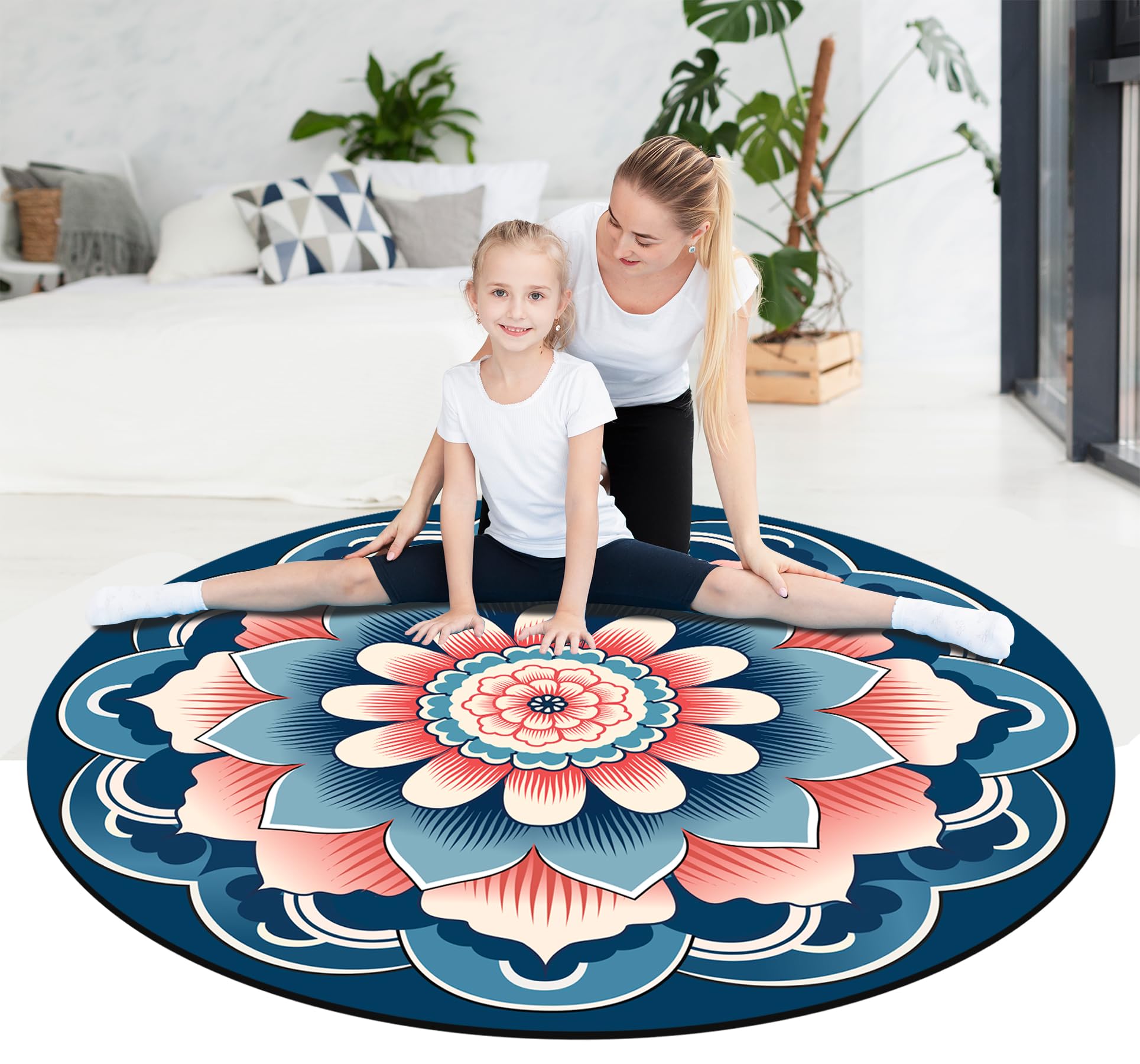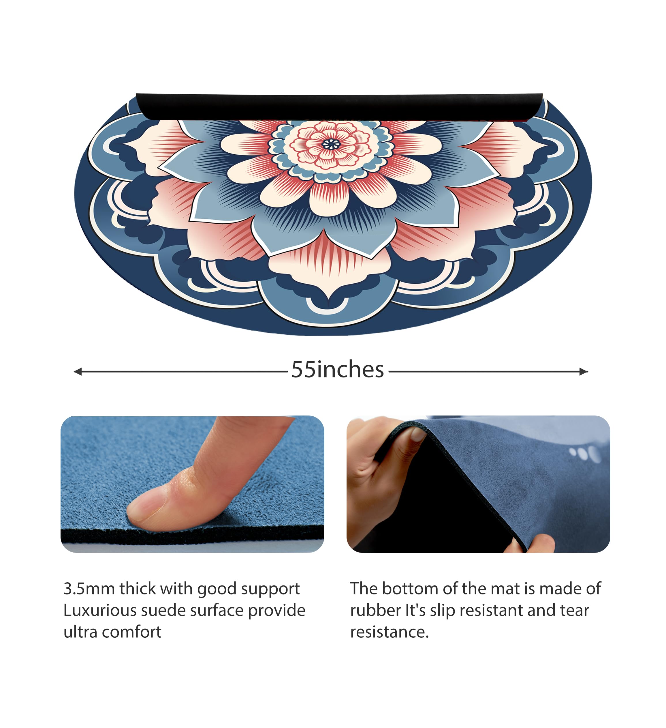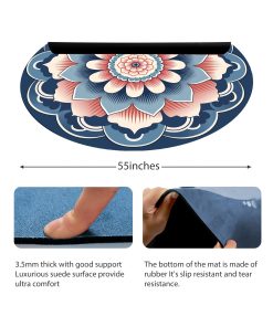 1. Tamaño: El super grande tapete circular de yoga de IKULE con un diámetro de 55 pulgadas es suficiente para que lo uses durante el ejercicio. Un grosor de 3.5mm puede prevenir la pérdida de puntos de apoyo durante los movimientos y garantizar menos riesgo de lesiones durante el entrenamiento.