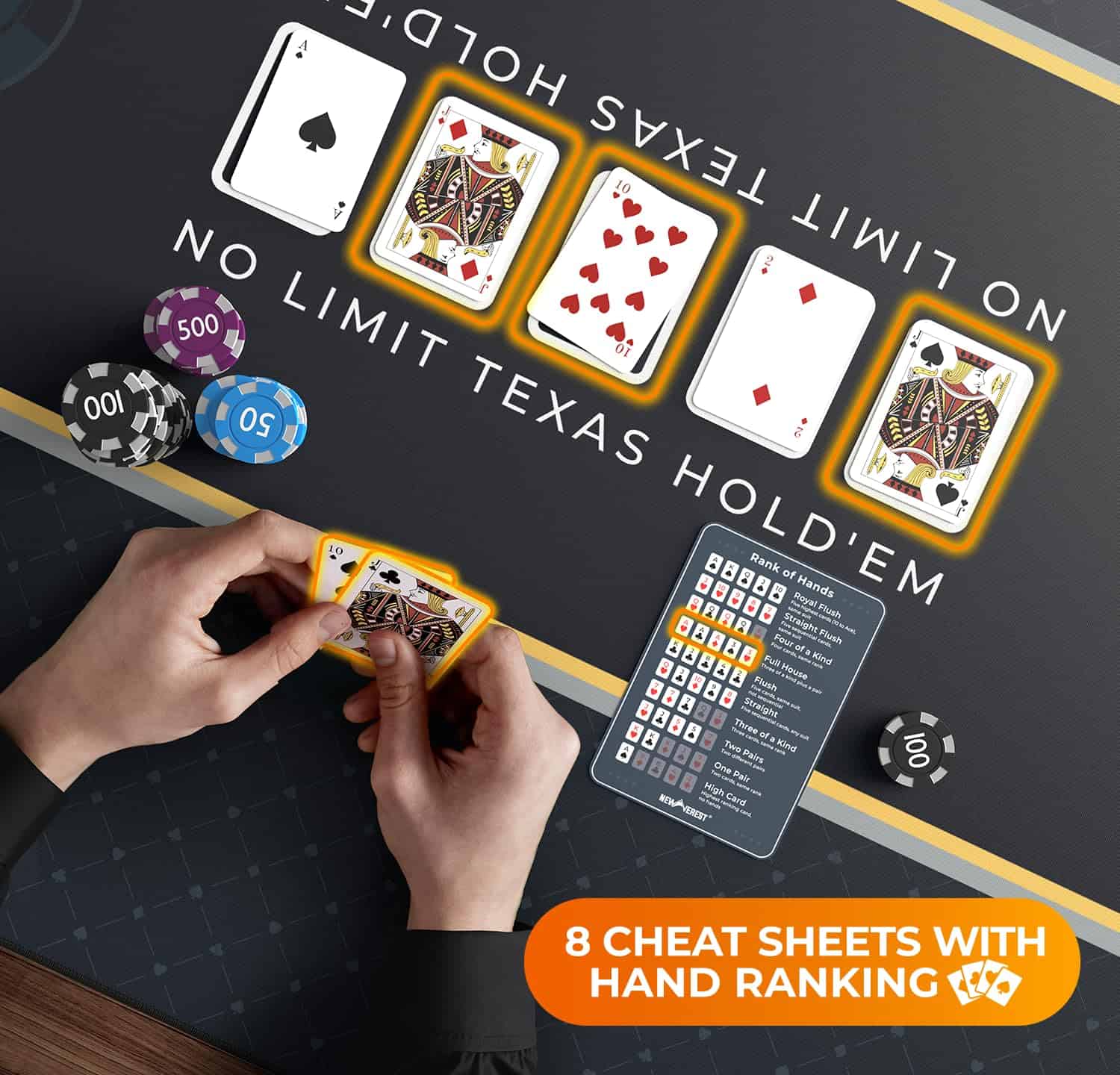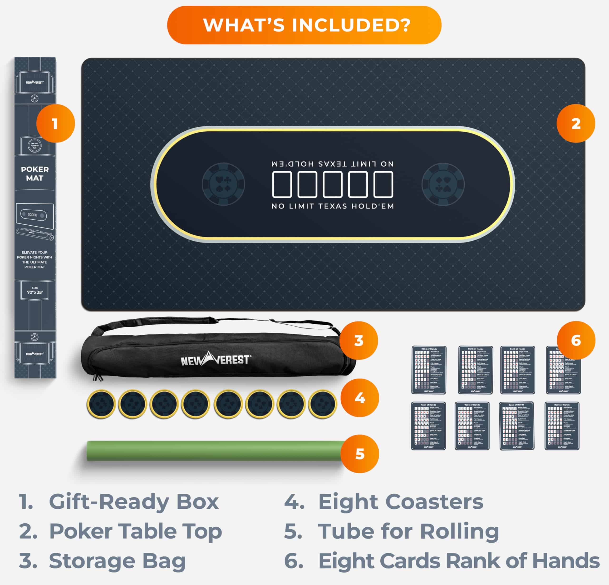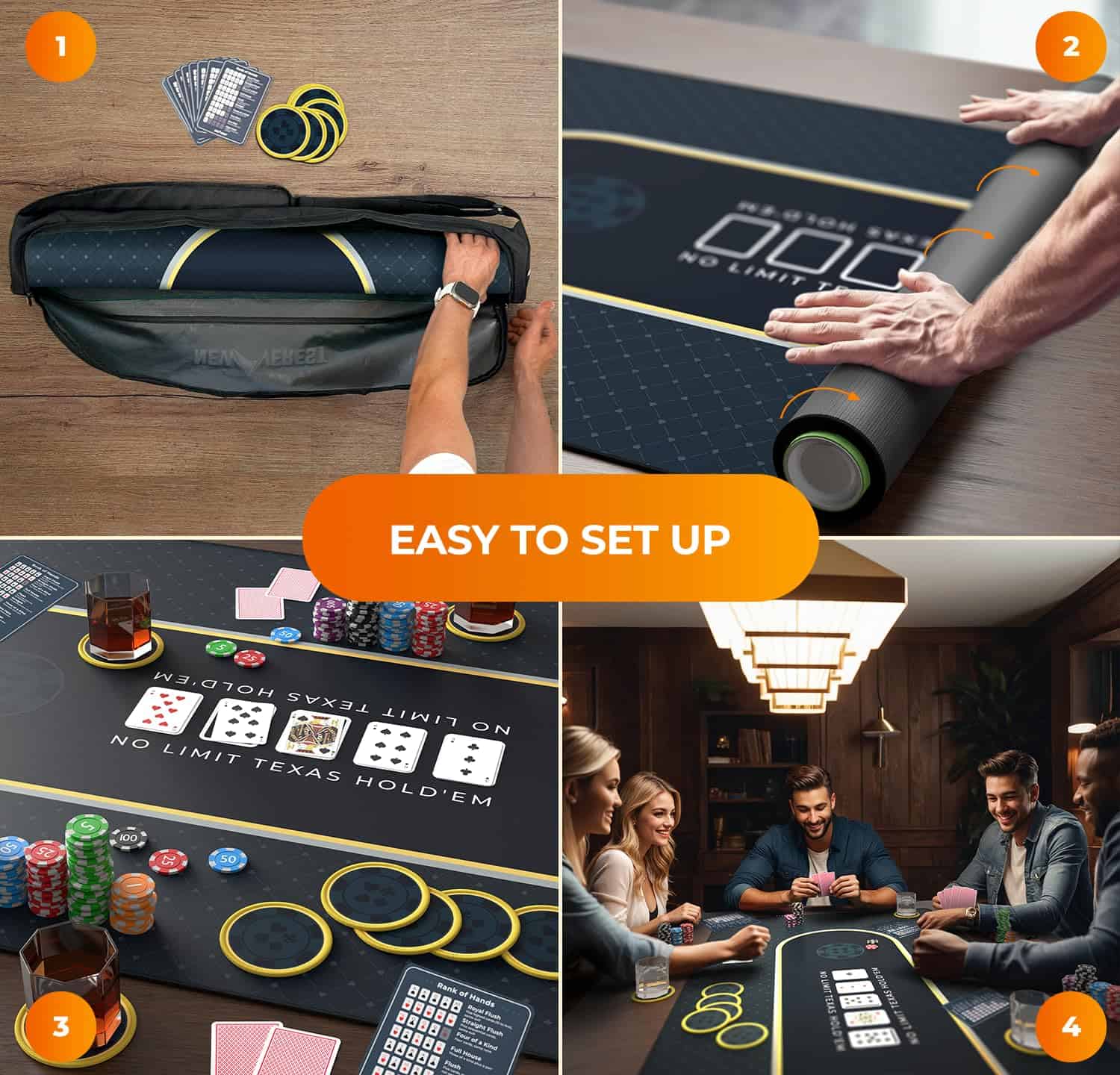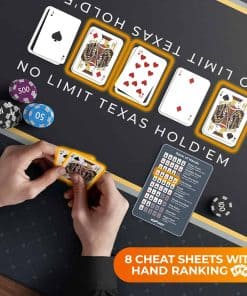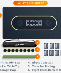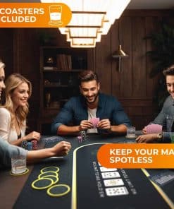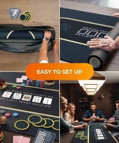 Transforma tu mesa de comedor en un vibrante casino con el Tapete de Mesa de Poker de Newverest. Este tapete de poker, que mide espaciosos 70″ x 35″, se ajusta cómodamente a hasta 10 jugadores, siendo perfecto para Texas Hold’em, blackjack y otros juegos de casino. Ya sea una reunión de fin de semana, una celebración de vacaciones o una noche de poker especial, nuestro tapete garantiza que todos tengan su lugar en la mesa. El tapete de poker de Newverest es más que un simple tapete de mesa de poker; es una experiencia de juego completa. Viene con 8 posavasos para proteger tu tapete de manchas de bebidas antiestéticas, y 8 tarjetas de inserción para referencias rápidas de manos de poker, garantizando un juego fluido e ininterrumpido. Di adiós a la molestia de mirar el teléfono durante rondas intensas de poker. El almacenamiento es sencillo con nuestra bolsa de cremallera fácil de empacar. A diferencia de los tapetes de mesa de poker tradicionales, nuestro diseño plegable, junto con una bolsa de cremallera horizontal, permite un fácil almacenamiento enrollable, evitando la incomodidad de las bolsas con cordón. Es un cambio de juego para los entusiastas del poker que valoran tanto la practicidad como el estilo. Hecho de material duradero y fácil de limpiar con una base de goma antideslizante y una superficie de poliéster elegante, replica la sensación de las mesas de casino profesionales. La limpieza es sencilla, asegurando que tu tapete de poker permanezca en condiciones prístinas para innumerables juegos. Regalar es más sencillo con nuestro paquete listo para regalar. Al llegar en una caja elegantemente diseñada, este tapete de mesa de poker es el regalo ideal para cualquier amante del poker, mejorando la Navidad, Año Nuevo, cumpleaños y otros eventos memorables. Mejora tu juego en casa con el Tapete de Mesa de Poker de Newverest – una combinación perfecta de funcionalidad, estilo y conveniencia para cada entusiasta del poker!