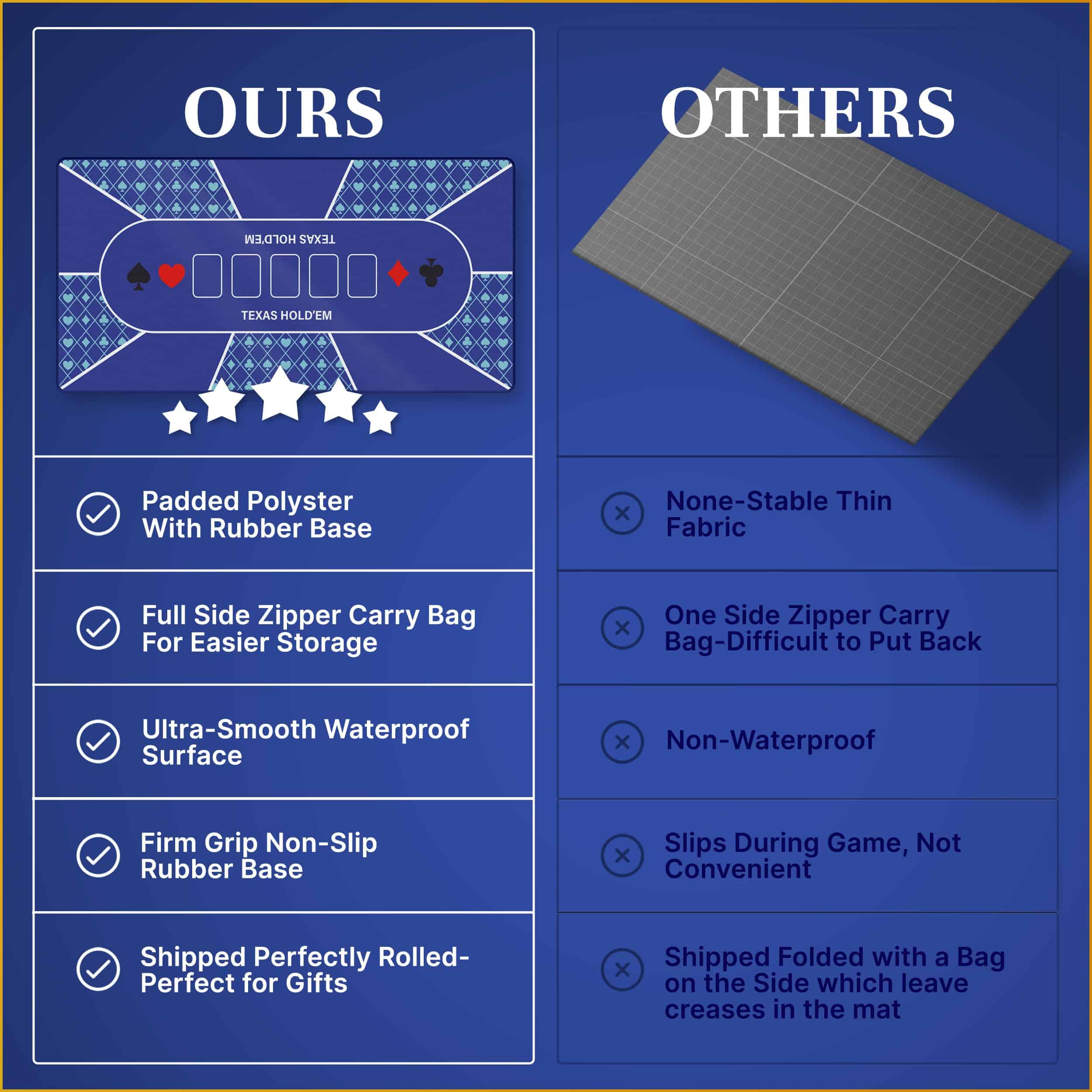 5. DESZIP, ENROLLA Y JUEGA – Nuestro tapete de poker permite una configuración rápida y sin complicaciones. Cuando el juego ha terminado, se puede enrollar convenientemente y guardar en la bolsa de transporte incluida, ahorrando espacio y tiempo.