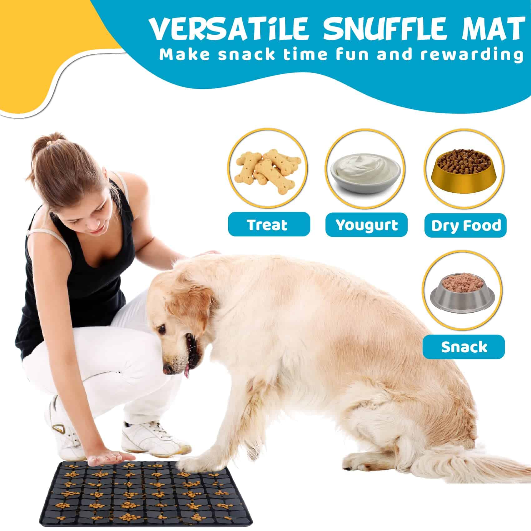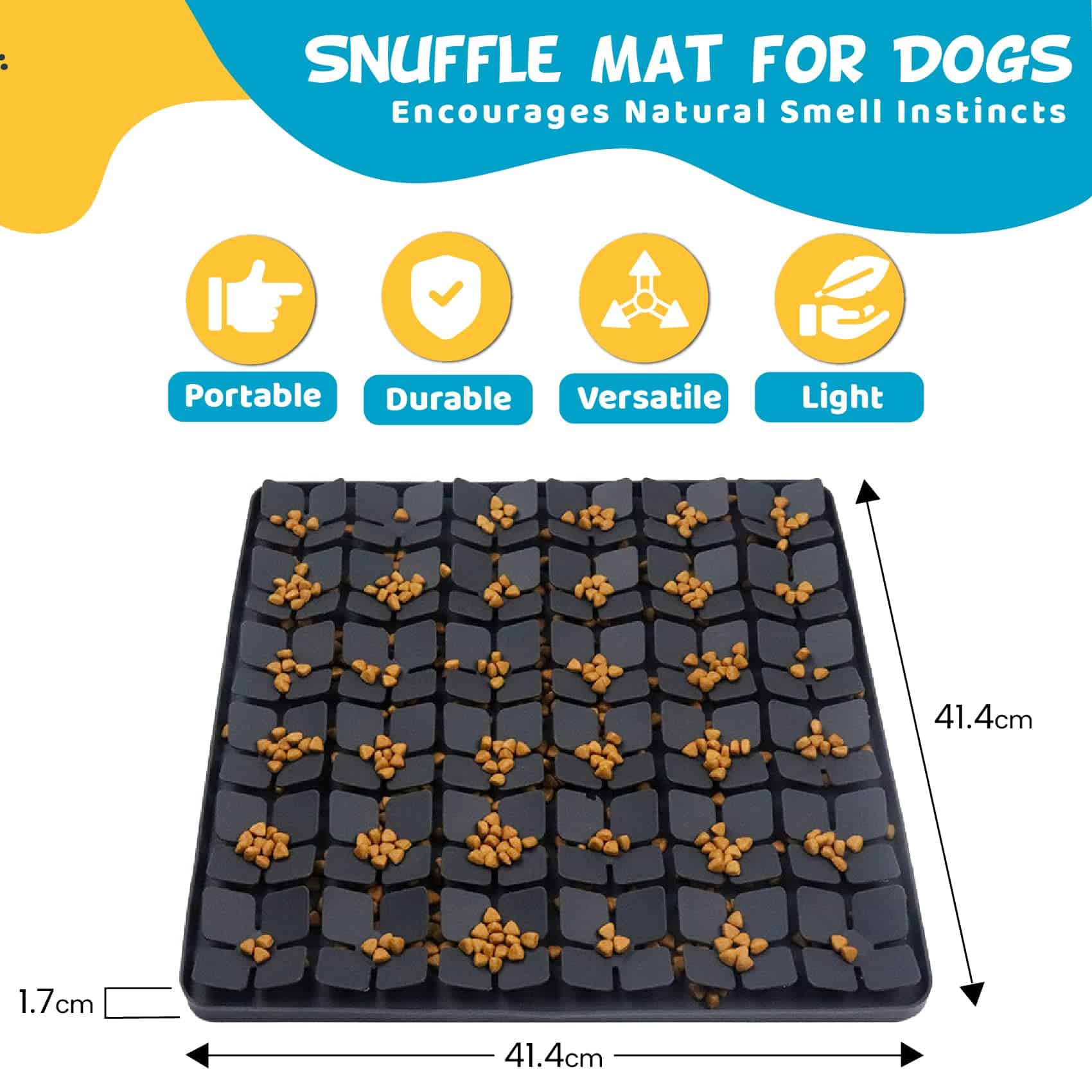 1. Fomente los instintos naturales de su mascota: El tapete de olfateo fomenta los comportamientos naturales de su perro entrenando su sentido del olfato. Su amigo peludo puede descubrir golosinas escondidas en el tapete, involucrando su nariz y cerebro en una búsqueda de alimentos, similar a lo que harían en la naturaleza.
