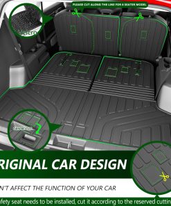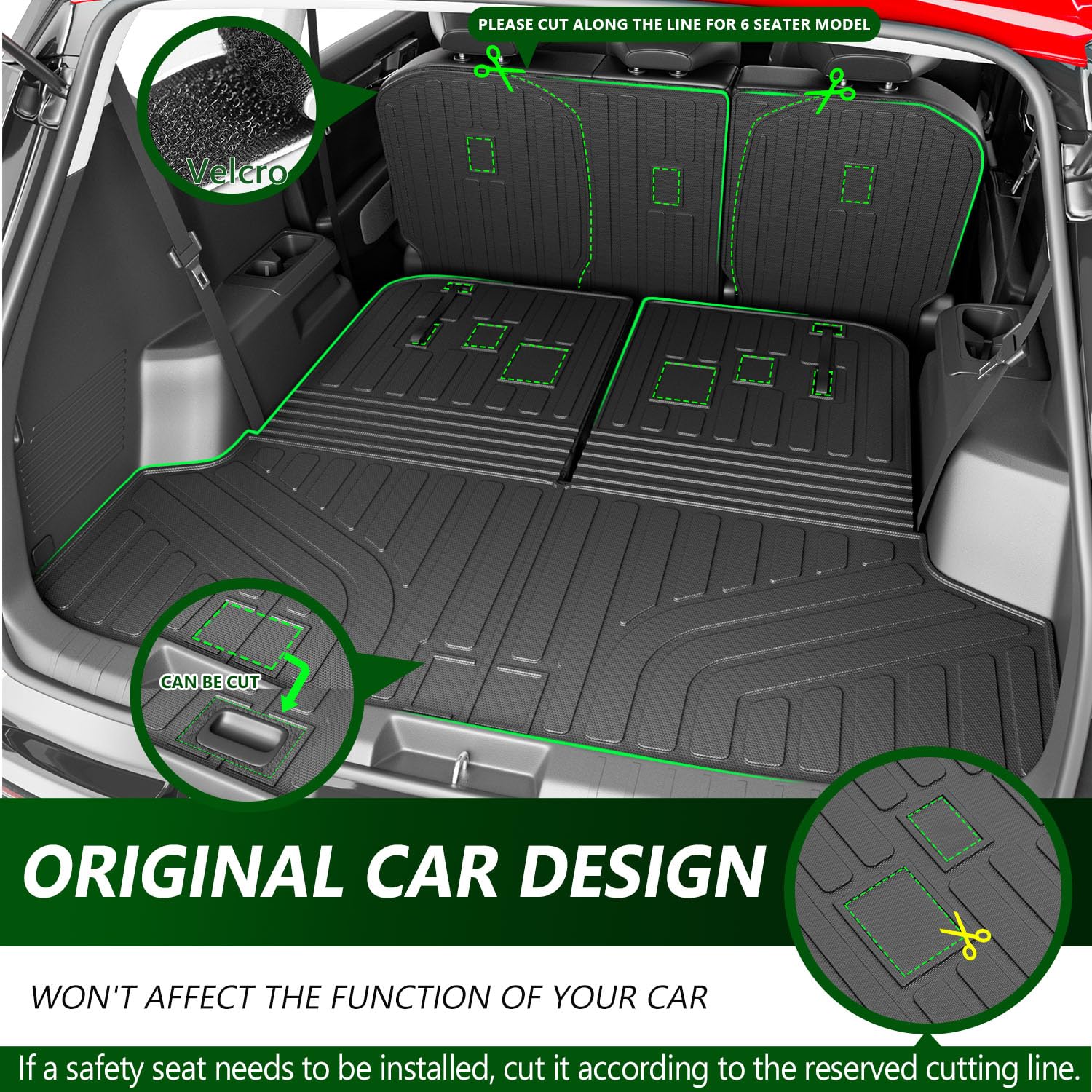 4. Fácil de Instalar: Nuestro revestimiento para cajuela y tapete para piso y tapete para respaldo de 2da fila compatibles con el revestimiento de cajuela de Kia EV9 son fáciles de instalar. Luego, simplemente coloque el tapete para cajuela con el revestimiento para respaldo en el lugar correcto. El revestimiento para respaldo viene con velcro para sujetar. Los tapetes para piso en la primera fila y segunda fila están asegurados para evitar que se muevan. Puede cortar el tapete de la tercera fila según sus asientos para que se ajuste a su automóvil.Si su automóvil tiene 6 asientos, necesitará cortar el tapete según el alambre de corte reservado en el tapete para respaldo de 2da fila.