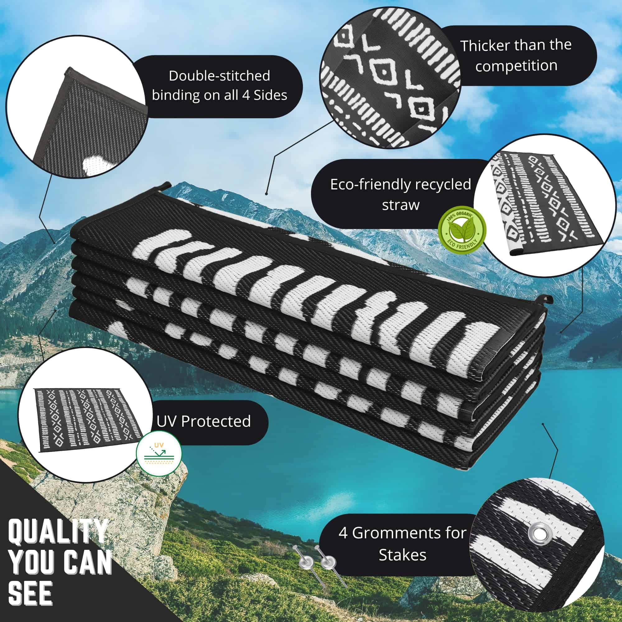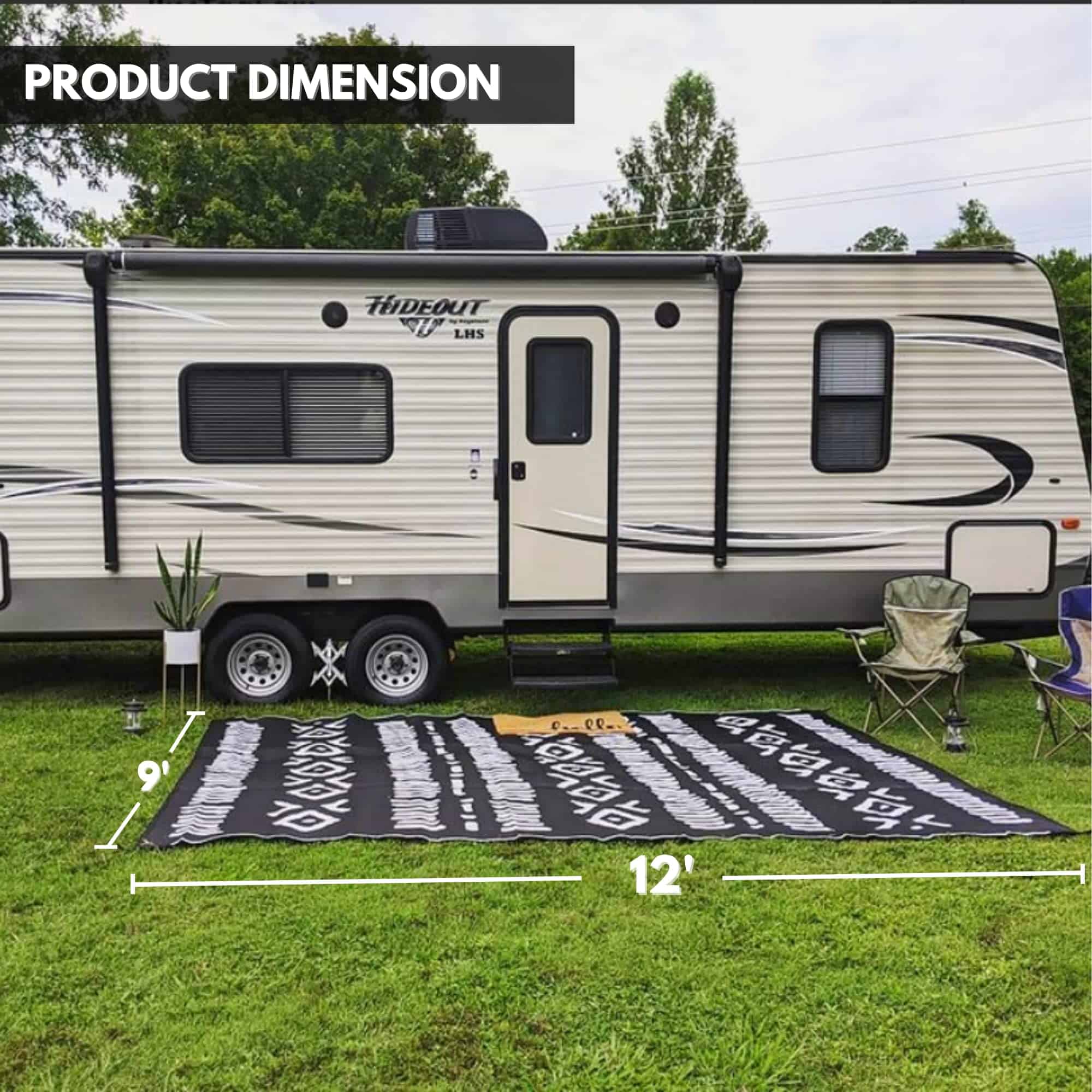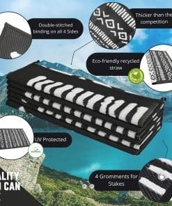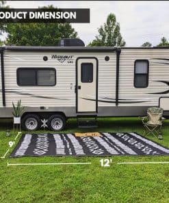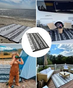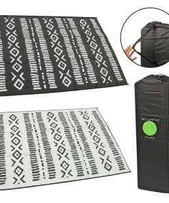 Sé el centro de atención en tu próxima aventura al aire libre con el Tapete de plástico reciclado Glamplife. Este elegante tapete para RV de 9×12 en negro y blanco tribal es perfecto para colocar en el exterior de tu RV, debajo de tu toldo o en tu patio. Con una durabilidad excepcional, este tapete para exteriores resistirá las inclemencias del clima y el desgaste diario.