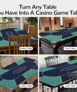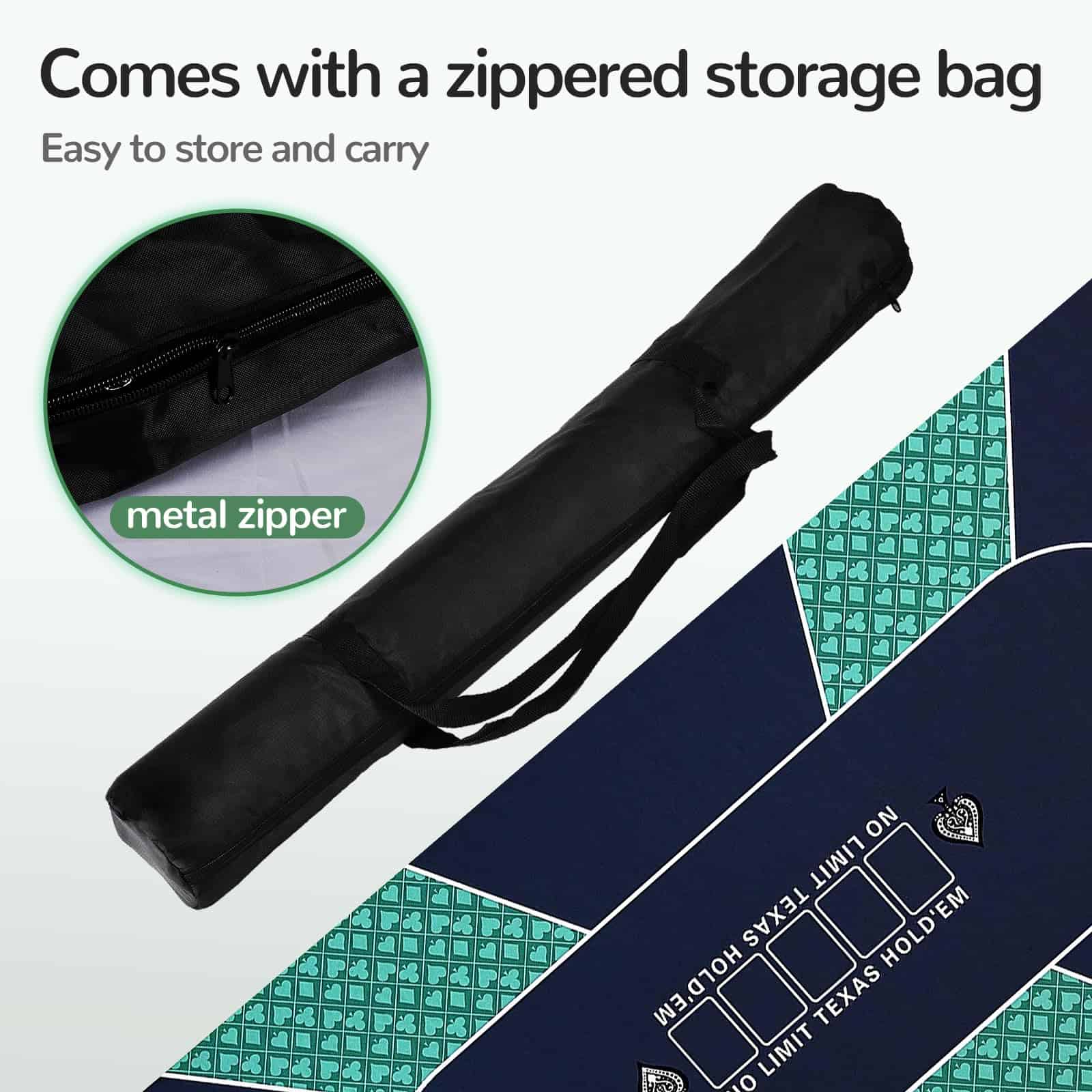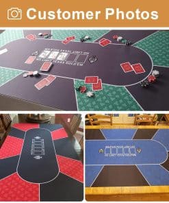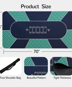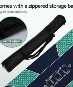 Si buscas una mesa de póker portátil y asequible para tus noches de póker ocasionales, ¡nuestro tapete de póker plegable FURUISEN es la solución perfecta para ti! ¡No necesitas comprar una mesa de póker completa cuando puedes ahorrar espacio y obtener la misma sensación de alta gama con este tope de mesa de póker. ¡Excelente para juegos en casa! Características del producto 1. Tapete de póker profesional de 3 mm de espesor que te permite sumergirte libremente en juegos de póker profesionales en cualquier momento y lugar y disfrutar de horas de diversión. 2. Diseño de tela especial, permite que la superficie del tapete de póker también sea fácil de limpiar, simplemente límpialo con un paño húmedo y mantendrá su estado nuevo. 3. Más protección del medio ambiente, centrado en el proceso de procesamiento detallado, proceso de cierre de bordes finos, reduciendo los daños del tapete de póker. 4. Con una superficie suave y un bolsillo de almacenamiento para que puedas enrollarlo fácilmente y guardarlo. Fácil de transportar, se puede usar en juegos en casa y al aire libre. 5. Cubrirá perfectamente una mesa ovalada o rectangular típica, como una mesa de comedor, una mesa de picnic, una mesa de cartas regular, etc. 6. Superficie suave y cómoda, se extiende completamente plana una vez desplegada y no se desliza, no tiene costuras que afecten al repartir cartas durante los juegos. Especificaciones Color: Verde/Azul Peso neto: 6 lbs Dimensiones desplegadas: 70» L x 35» A Dimensiones plegadas: 70» L x 4» W Material: Goma Paquete incluido 1 x Tapete de Póker Tope 1 x Bolsa de transporte
