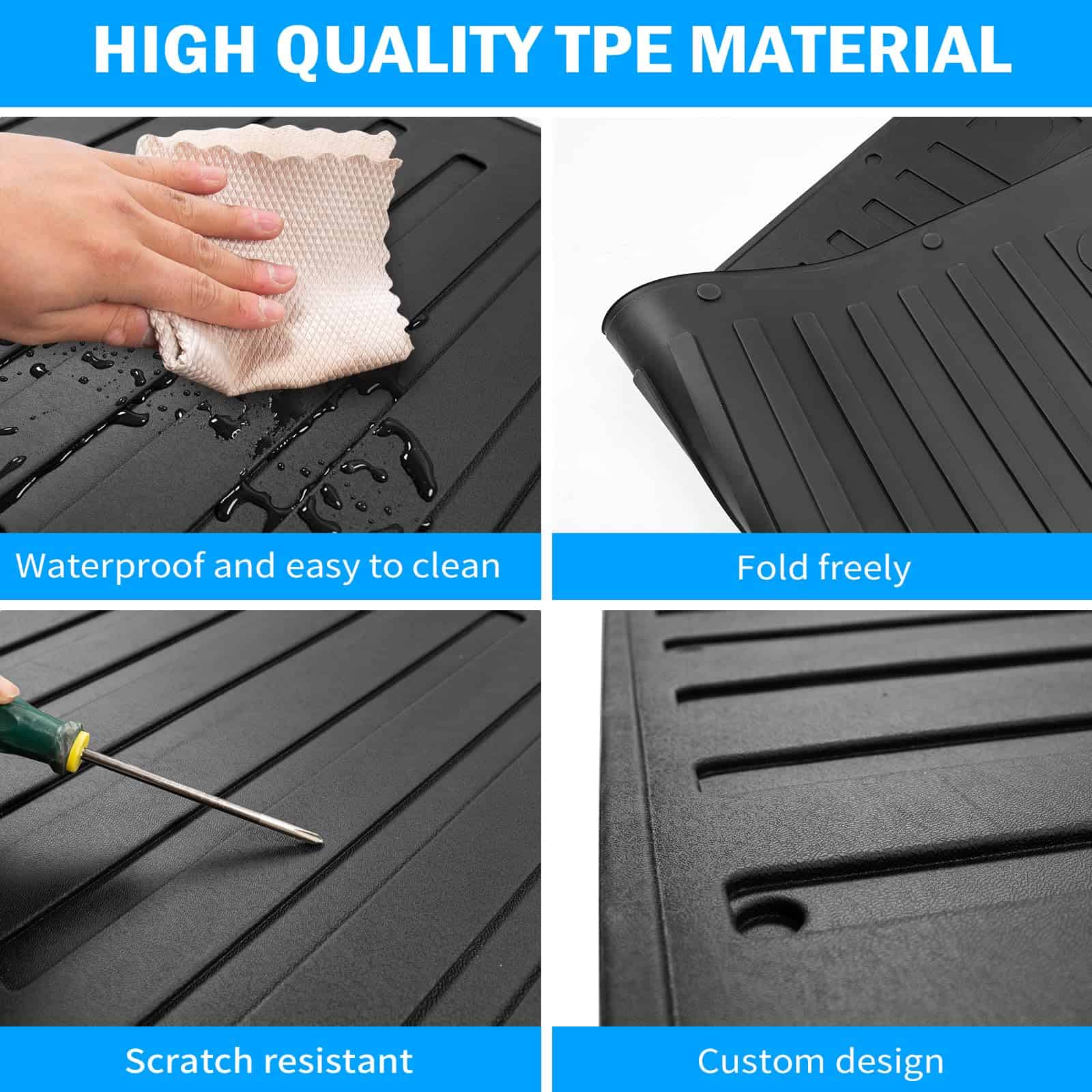 3. Material: Nuestro tapete de portón está hecho de TPE (Elastómero Termoplástico) de alta calidad, con alta resistencia, elasticidad, respetuoso con el medio ambiente, no tóxico y sin olor. En comparación con los tapetes de goma, nuestros tapetes de TPE son más ligeros y no tienen olor.