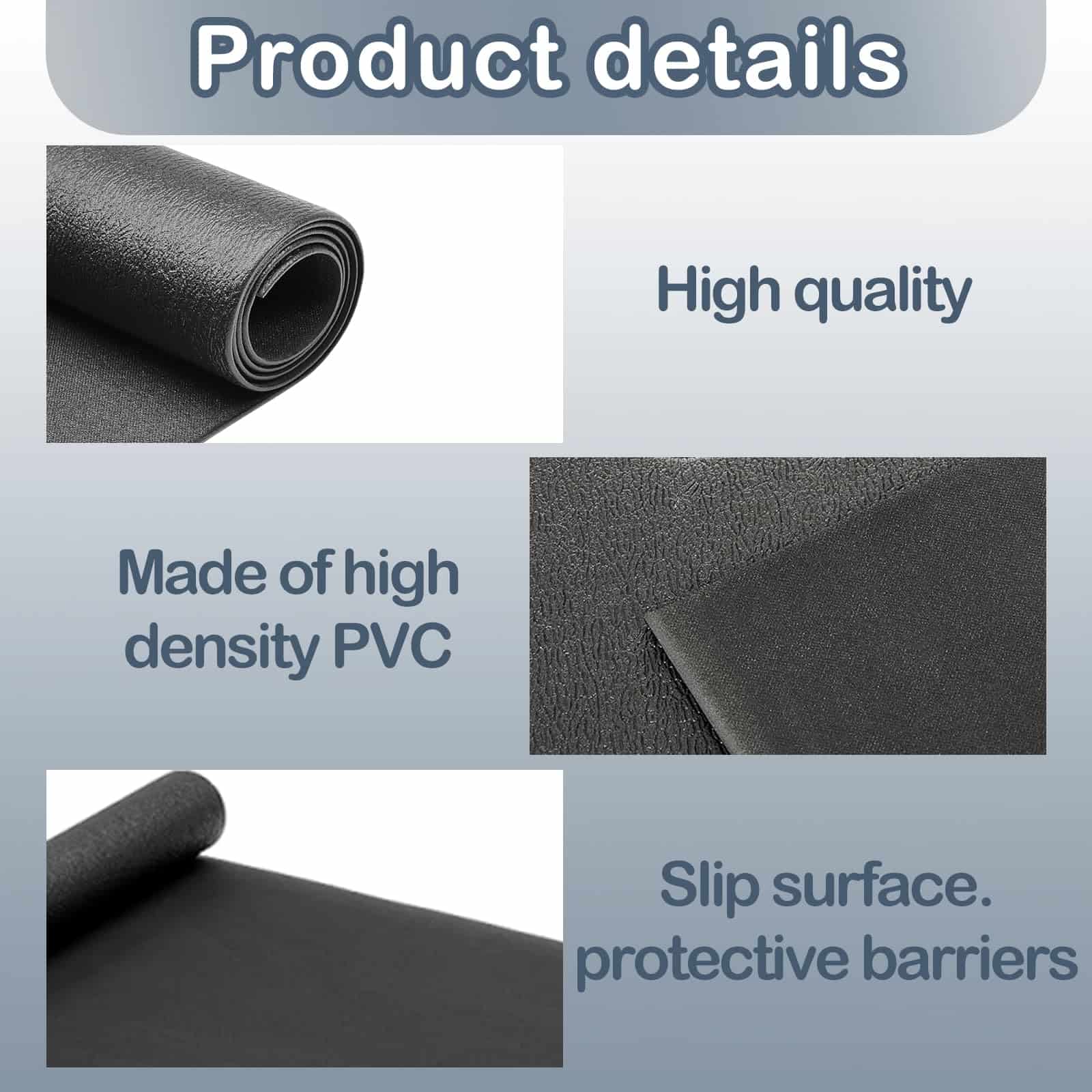 2. Tapete de goma resistente para proteger los pisos El PVC de alta densidad actúa como un grueso tapete de goma para proteger pisos de madera, vinilo, alfombras o azulejos de daños. Ideal como tapete para cintas de correr, tapete para equipo de ejercicio o suelo de gimnasio en garaje.