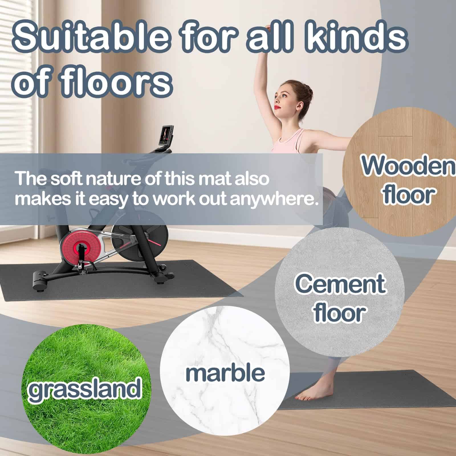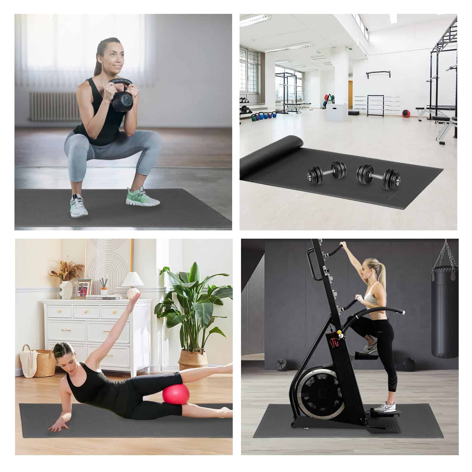 3. Antideslizante y absorbente de impactos La superficie texturizada antideslizante mantiene las máquinas de fitness estables y reduce la vibración. Ideal para entrenamiento de intervalos de alta intensidad, cardio y levantamiento de pesas. Evita deslizamientos en alfombras o pisos de madera.