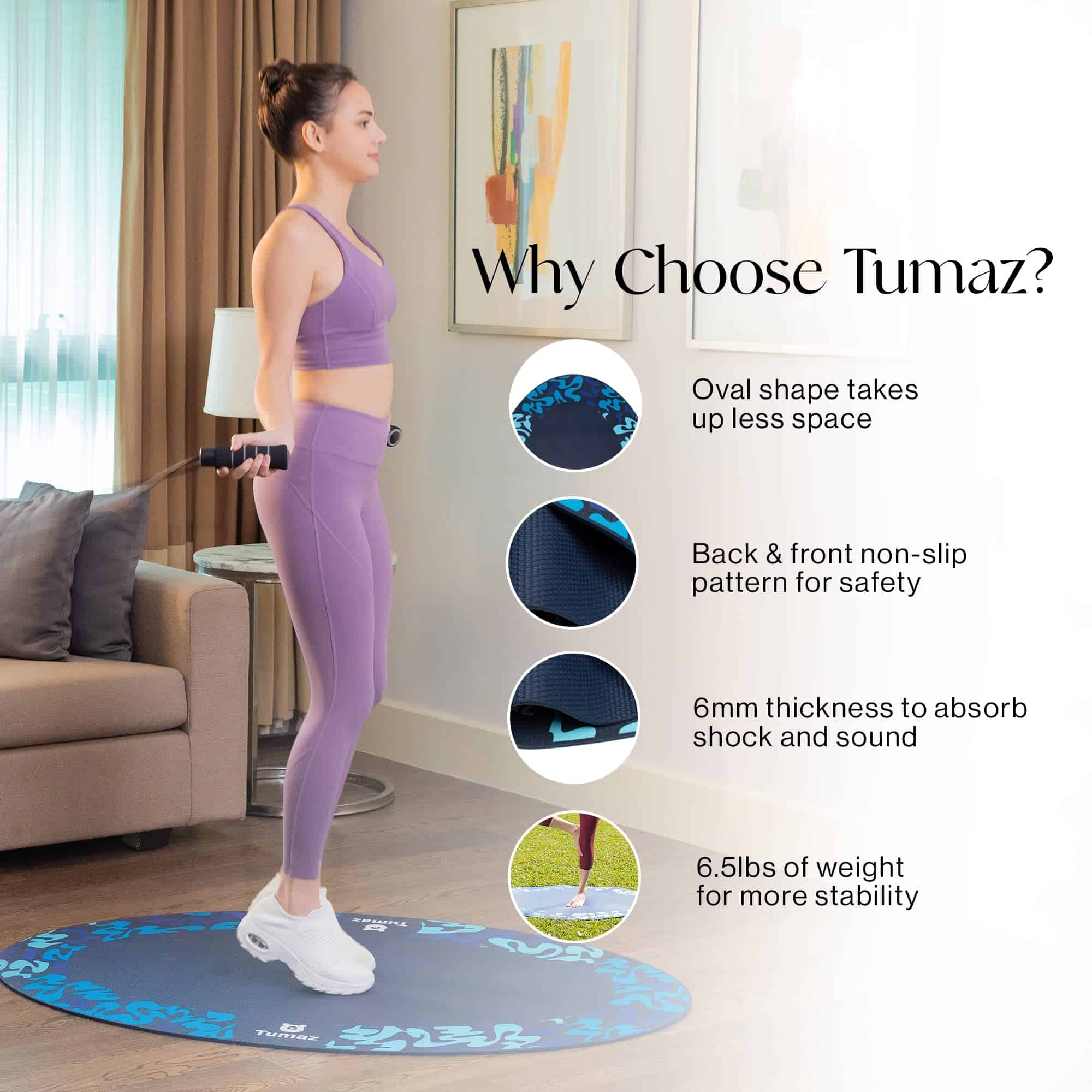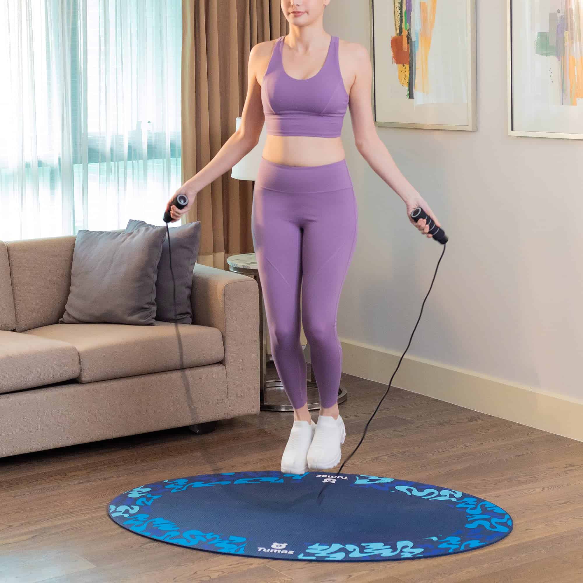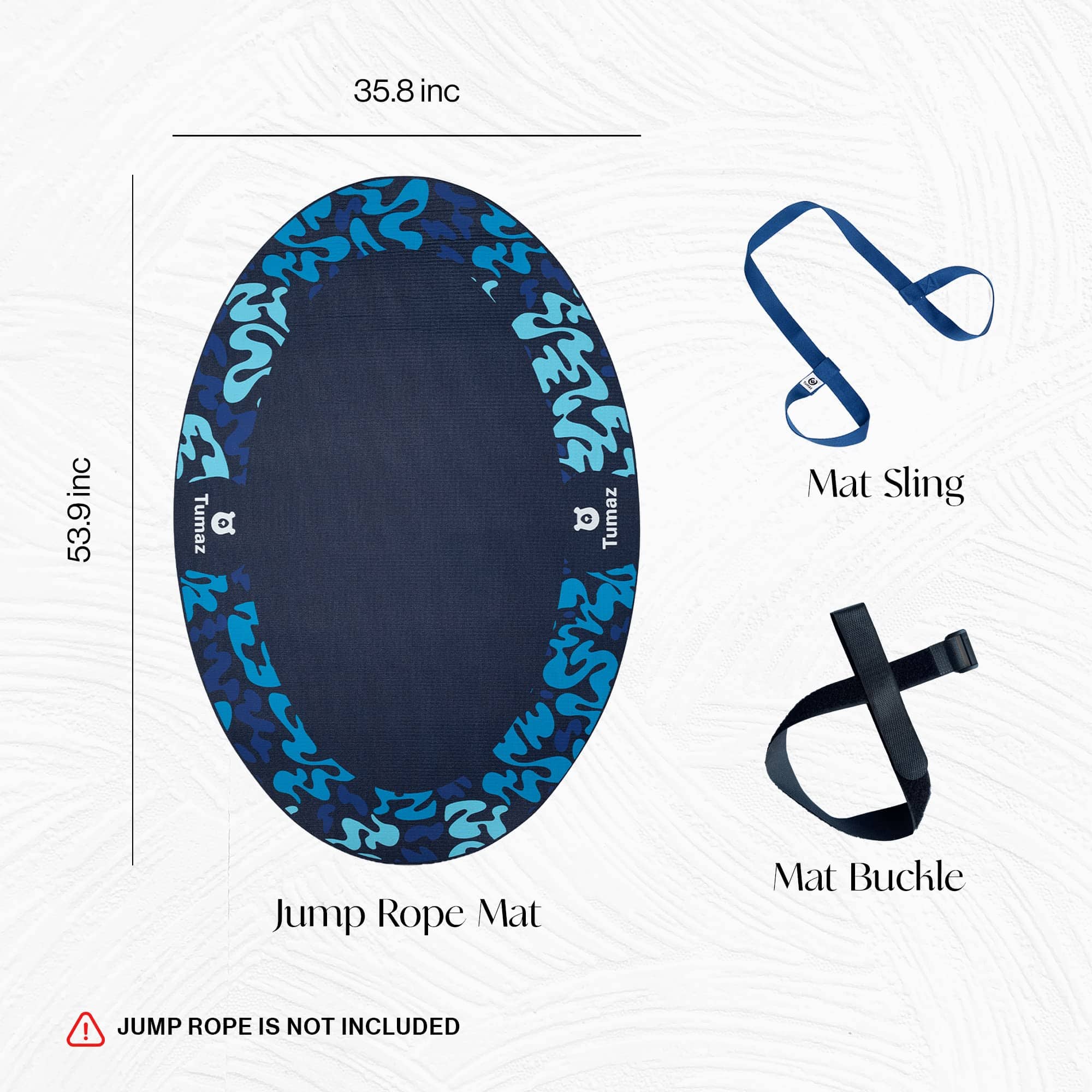 Tapete de saltar Tumaz, 54»x36» Tapete de Ejercicio Interior y Exterior, Tapete Antideslizante de 6mm de Grosor El ejercicio regular es crucial para mantener un estilo de vida saludable. Ya sea que estés saltando la cuerda para entrenar o practicando yoga o pilates, es importante tener un espacio adecuado y seguro para tu rutina diaria. El tapete de saltar Tumaz es la solución perfecta para tus necesidades de ejercicio en el hogar o al aire libre. Con un diseño ovalado único que cabe en espacios reducidos, este tapete es versátil y duradero. Fabricado con PVC grueso y duradero, este tapete absorbe el impacto y el ruido, protegiendo tus articulaciones durante tus ejercicios. Su diseño antideslizante en ambos lados garantiza tu seguridad y comodidad mientras te ejercitas. Ya sea en interiores o exteriores, en el suelo de madera o en el césped, este tapete es resistente y duradero. Incluye una correa para que puedas llevarlo a donde quieras, lo que lo hace perfecto para llevar a tus clases de fitness al aire libre. Además de su uso como tapete de saltar la cuerda, este versátil tapete puede ser utilizado para ejercicios de yoga, pilates y entrenamientos de fitness en casa. Con Tumaz, la satisfacción del cliente es nuestra principal prioridad. Ofrecemos un reemplazo o reembolso para todos nuestros productos dentro del período de garantía de 60 días. Sin necesidad de explicaciones, nuestro proceso de devolución es simple y sin complicaciones. ¡Haz que tu rutina de ejercicios sea más segura y cómoda con el tapete de saltar Tumaz!