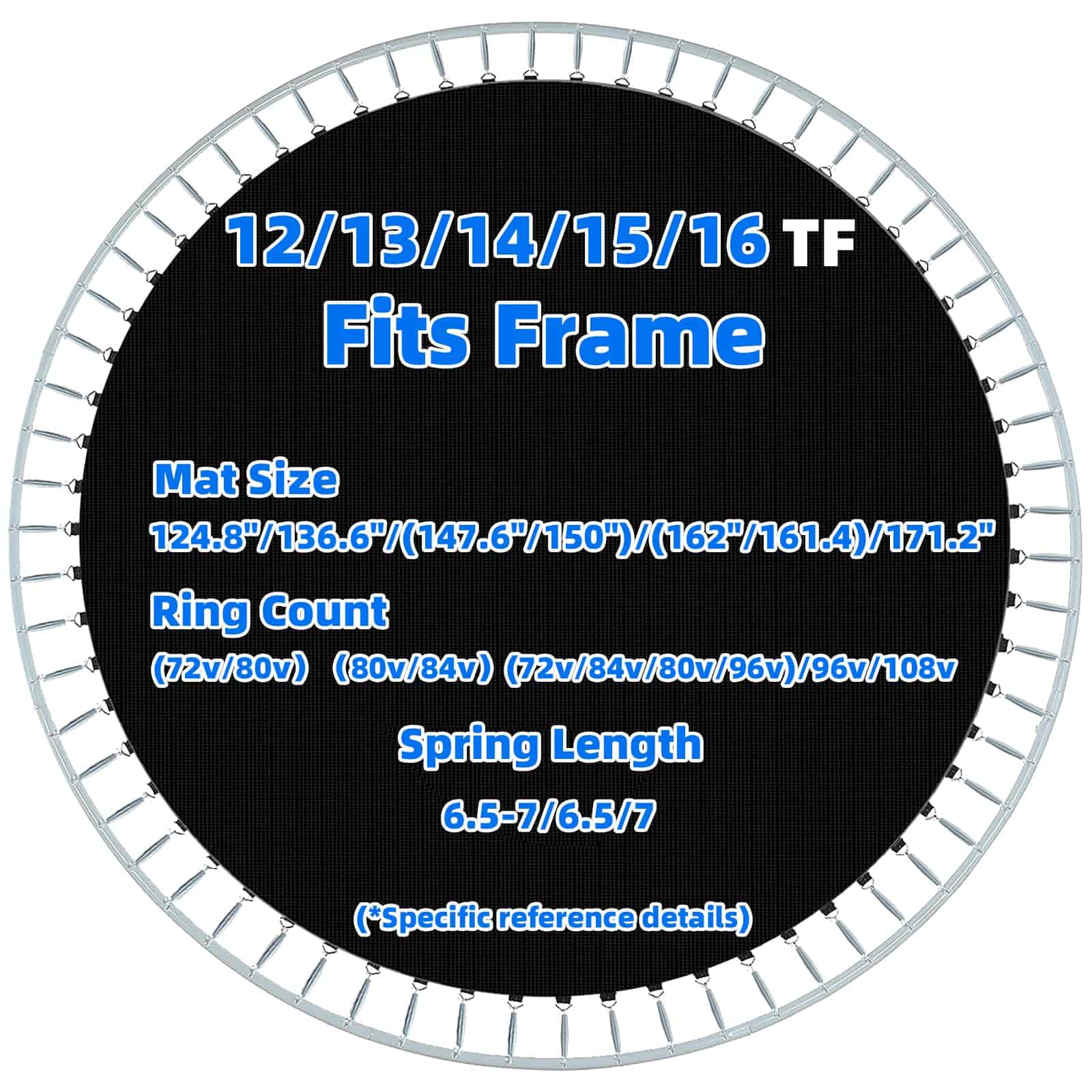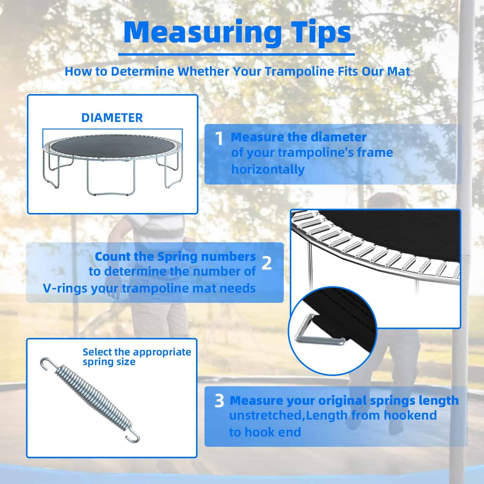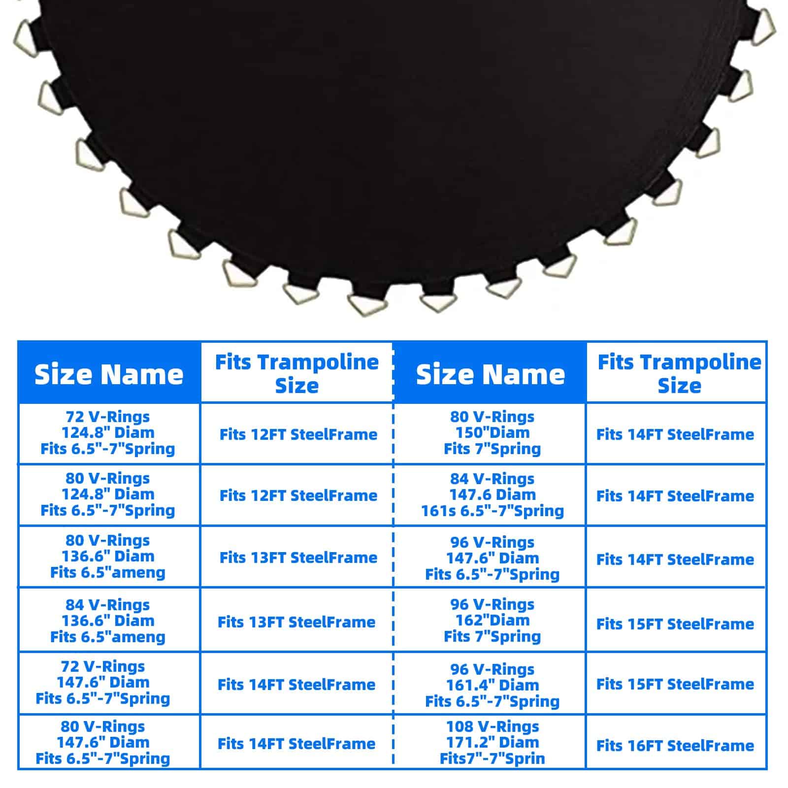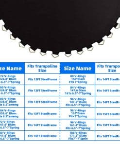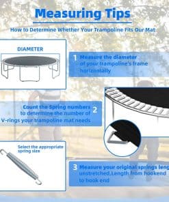 1. Dimensiones de Selección: Cada trampolín está equipado con un tapete de trampolín único. 1. Mida el Diámetro del tapete original (no incluya el Anillo en V) 124.8»; 2. Cuente 72 anillos en V, agujeros para resortes y resortes de 6.5» (sin estirar); 3. Mida que su trampolín tiene un Diámetro de 12 pies: 124.8″ para trampolín redondo de 12′.