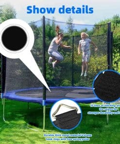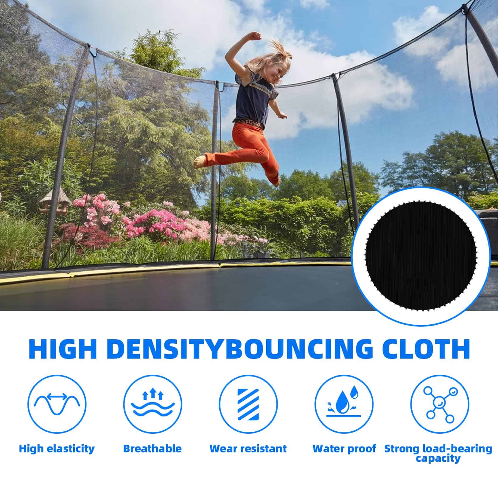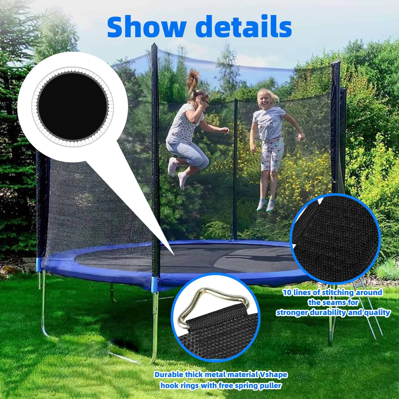 2. Duradero: Nuestros tapetes de trampolín premium están fabricados con especial atención al detalle, durabilidad y hechos con tela de polipropileno de la más alta calidad en la industria, que es resistente a los rayos UV y al desvanecimiento. La costura es generalmente la segunda cosa que se va, 8 filas de costura para mayor resistencia y estabilidad, asegurando durabilidad mejorada y una larga vida útil, ideal para uso al aire libre en jardines y patios traseros.