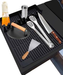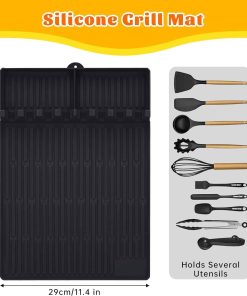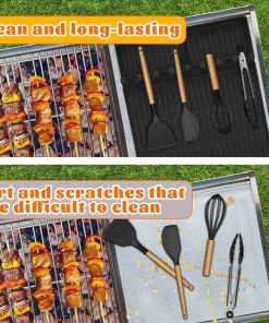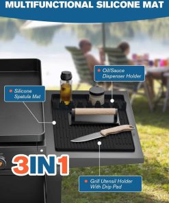3. Este tapete de silicona para utensilios puede usarse para sostener cucharas, espátulas, cucharones, pinceles, pinzas o tenedores, también puede usarse para sostener frascos de condimentos para la parrilla BBq. Son ideales para la cocina, cocción y encimera para mantenerlas limpias. ¡Nunca más se preocupe por manchar una encimera con una espátula sucia! Es la mejor opción de regalo para los accesorios de la parrilla BBq. Este tapete para utensilios de parrilla de silicona es perfecto para la mesa lateral de Blackstone.