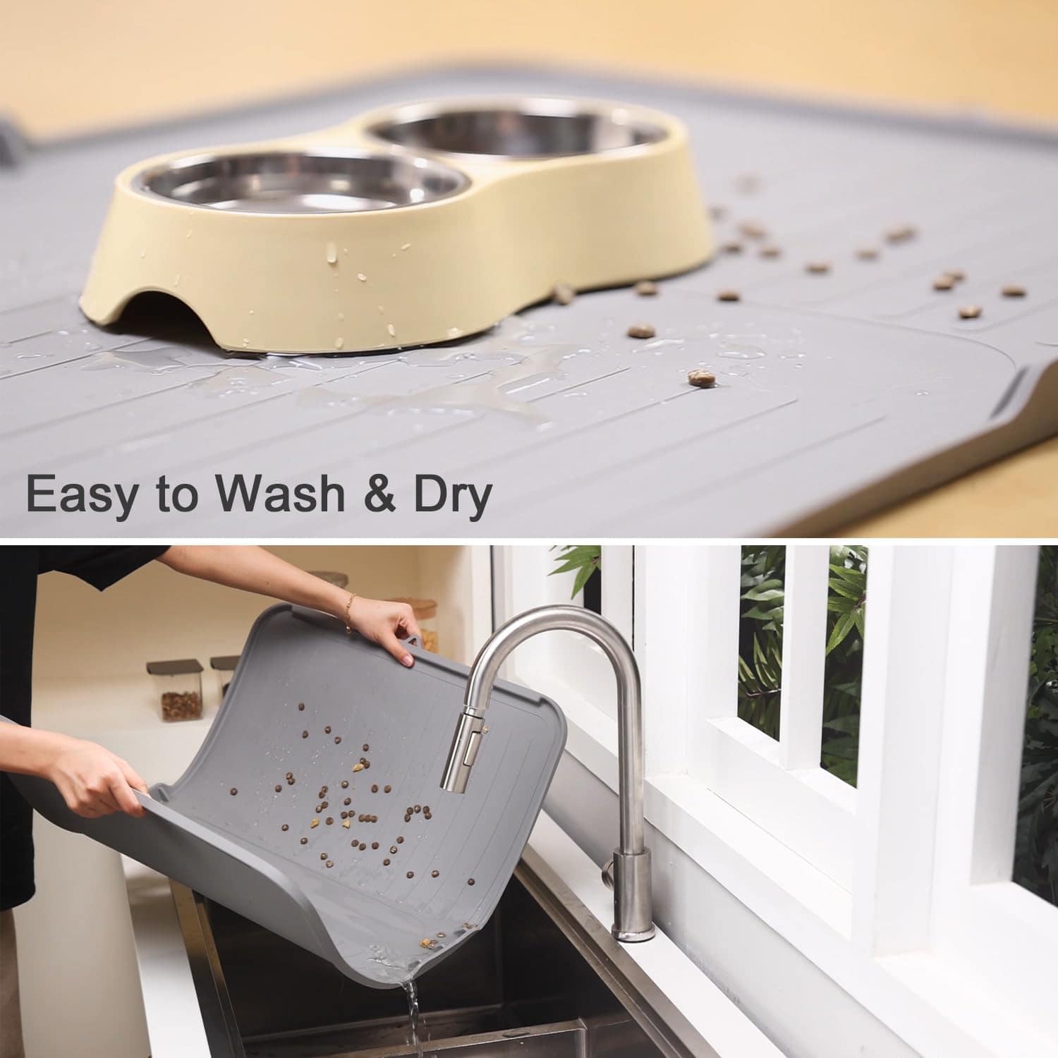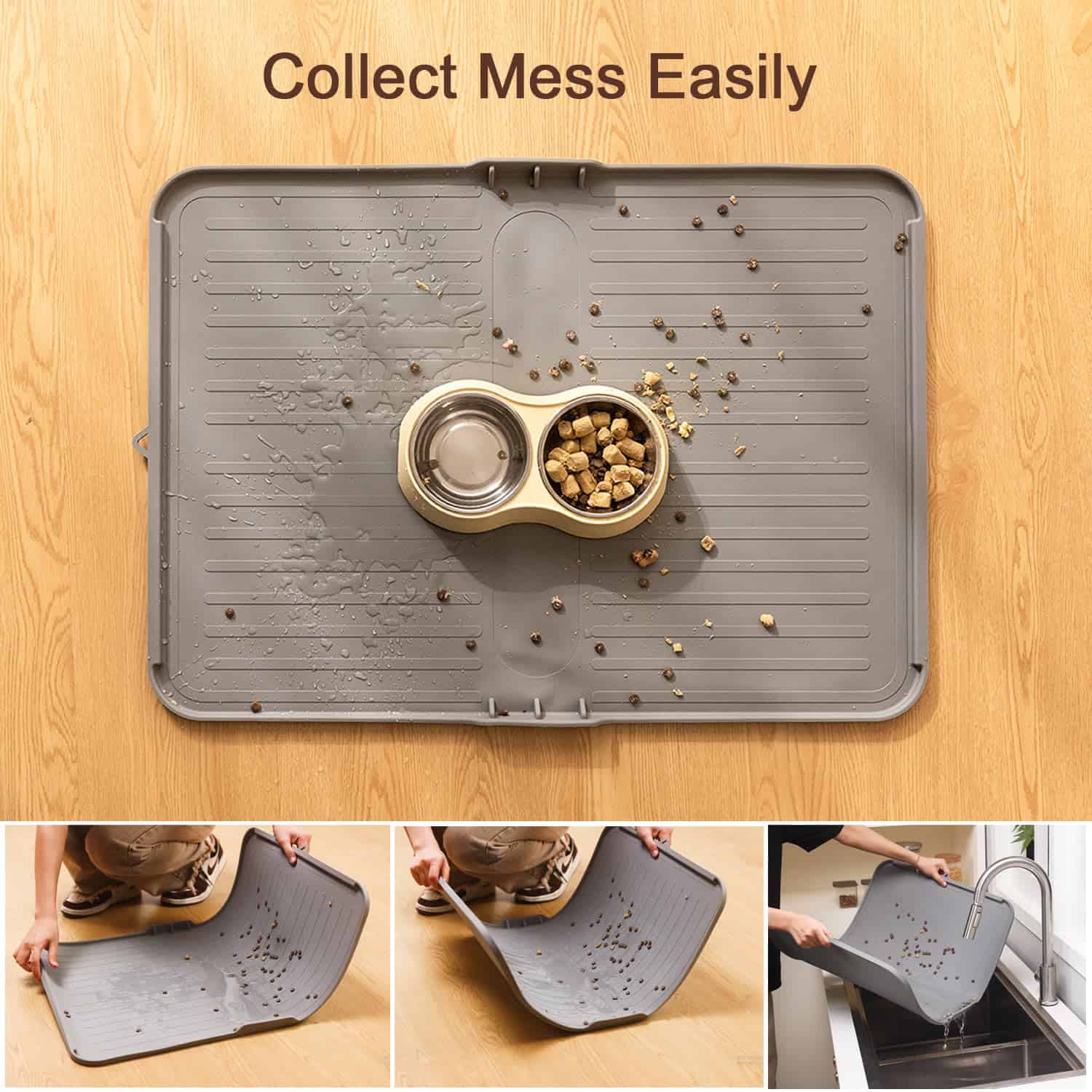 2. FÁCIL DE LIMPIAR – Simplemente levante los dos extremos del tapete de comida para mascotas de silicona y observe cómo el desorden se acumula convenientemente en el centro para una fácil eliminación. Es un excelente tapete de alimentación para mascotas para sostener cuencos de mascotas, cuencos de gatos, comederos, fuentes de agua potable y platos.