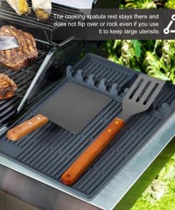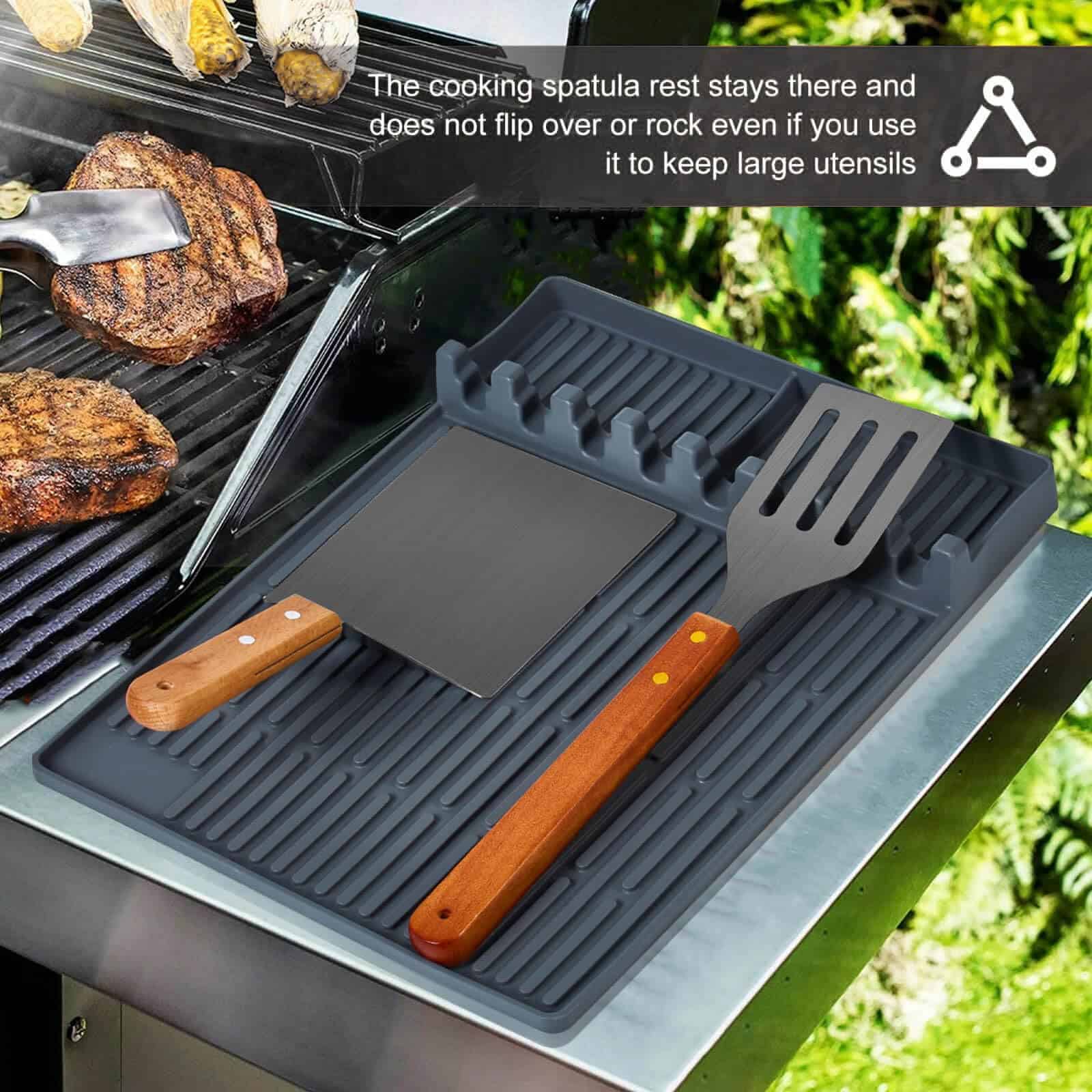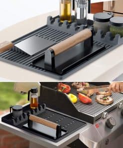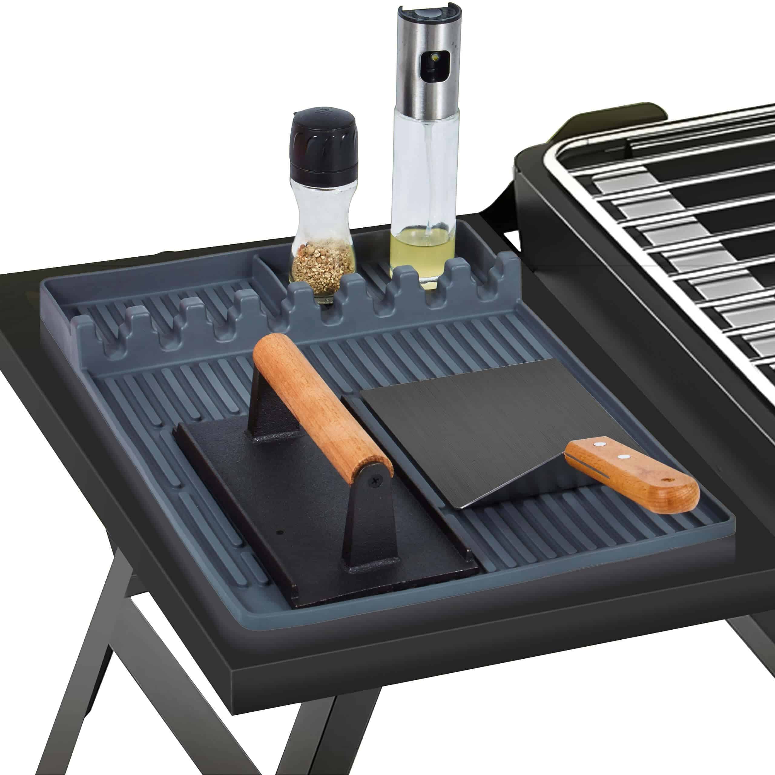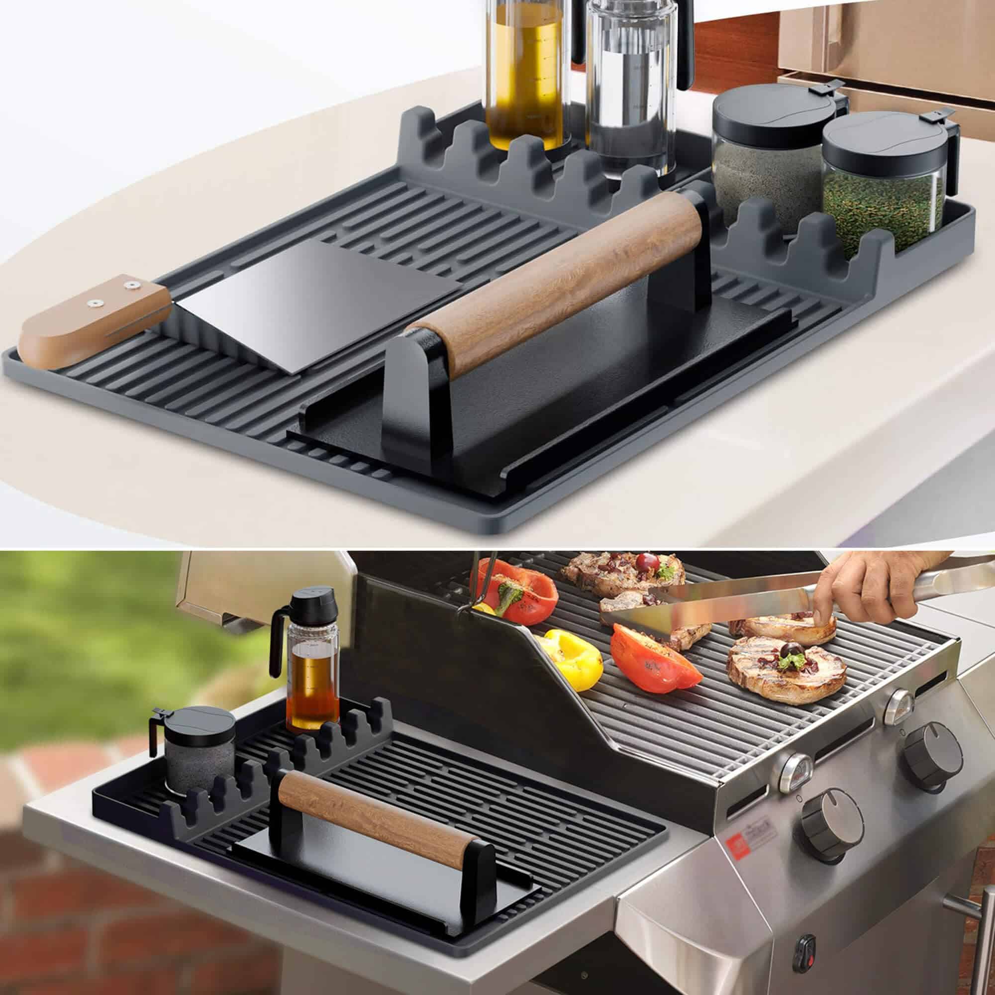 3. Poderoso Tapete Raspador de Barbacoa: Este versátil tapete craterario de silicona está diseñado inteligentemente. El tamaño grande le permite que coincida con la repisa lateral de la parrilla Blackstone, protegiéndola de manchas. Este tapete de herramientas de parrilla tiene 8 ranuras, que pueden colocar mejor el cuchillo, tenedor, cuchara, etc. También puedes colocar botellas de aceite, botellas de condimentos, etc. Grandes prensas de parrilla de hierro fundido, grandes espátulas también se pueden colocar bien.