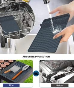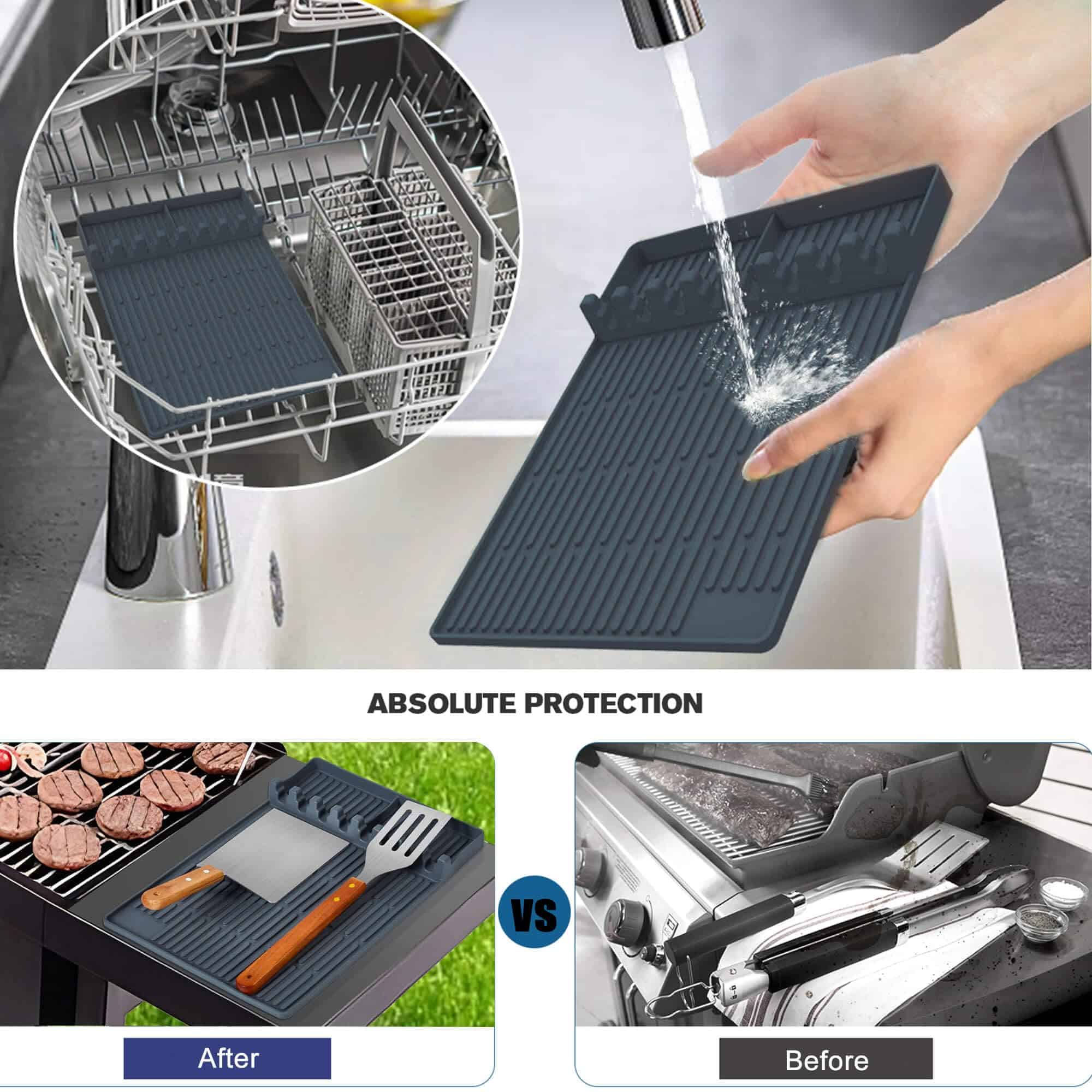 2. Seguro y Duradero: Este Tapete de Utensilios de Parrilla está hecho de material de silicona de grado alimenticio de alta calidad, extremadamente duradero, superficie lisa, reutilizable. Diseñado para cocinar en la cocina, barbacoa, etc., resistencia a altas temperaturas, antideslizante, no tóxico, seguro.