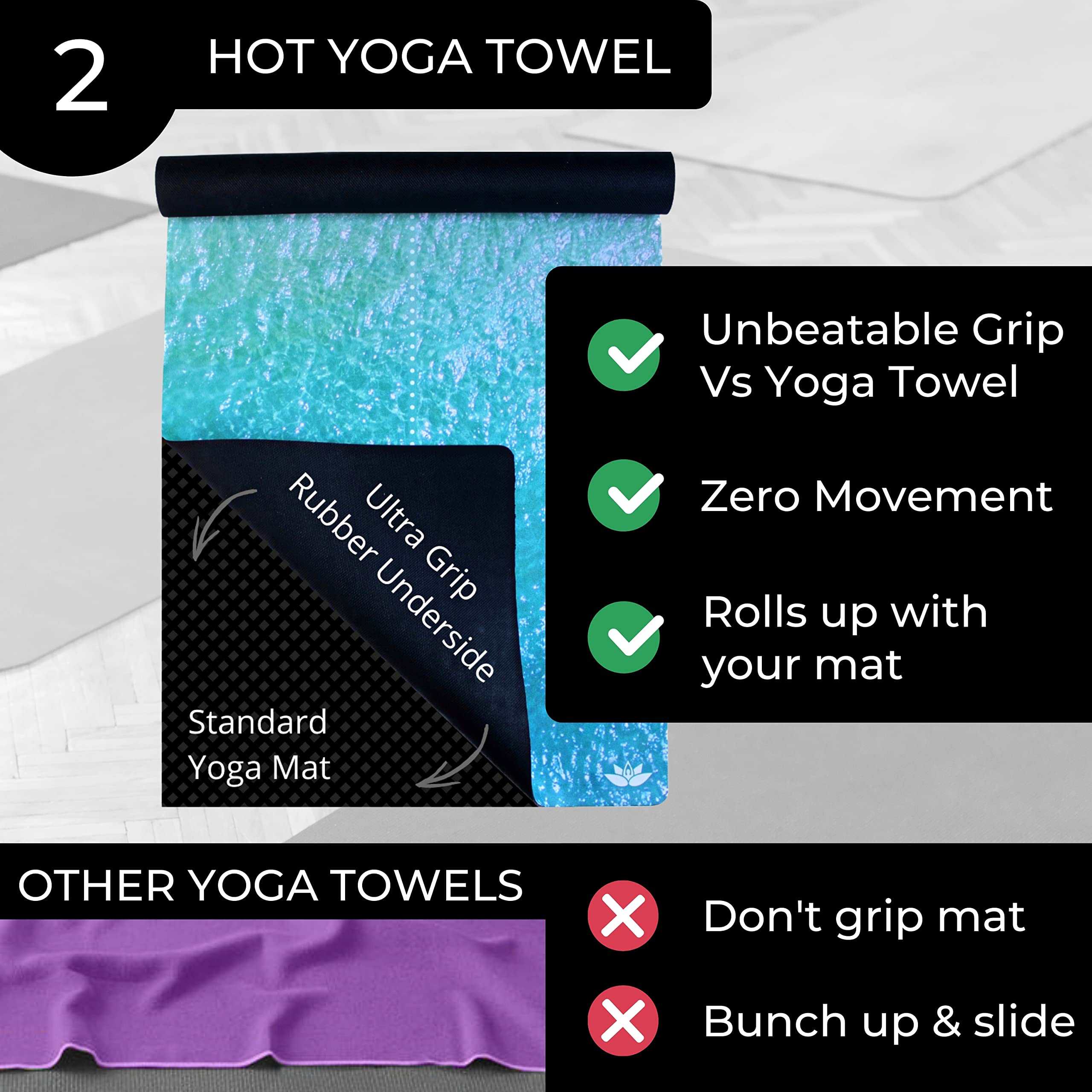 1. TAPETE Y TOALLA 3 EN 1 Utiliza tu tapete en el suelo de tu habitación de hotel, como capa higiénica en un tapete acolchado de estudio o como una toalla de yoga caliente antideslizante y dile adiós para siempre al molesto montón de toallas!.