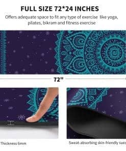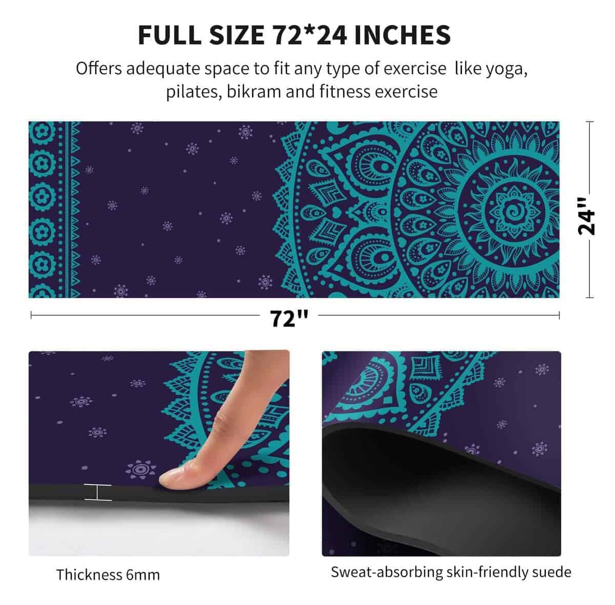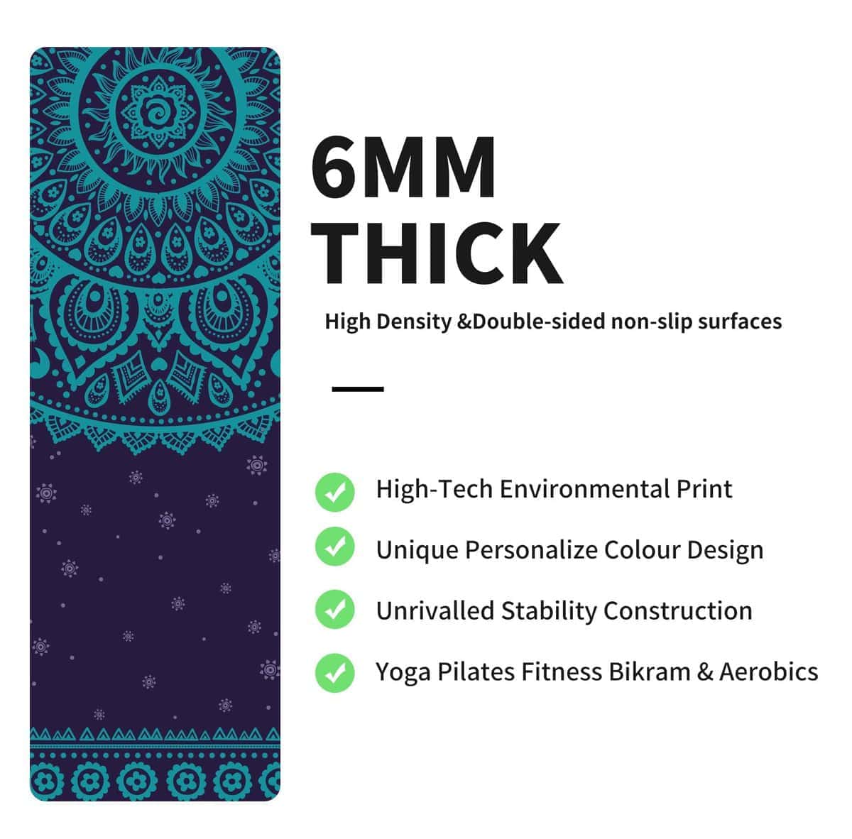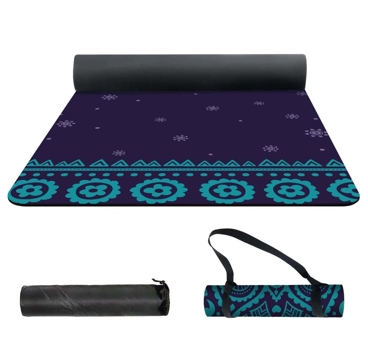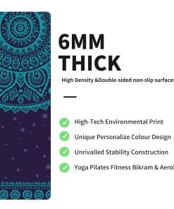Tapete de Yoga Estampado Extra Grueso de TPE Antideslizante nuveti con Bolsa de Transporte Este tapete de yoga de nuveti está diseñado con material TPE premium, que es suave, liviano y tiene una mejor elasticidad en comparación con los materiales tradicionales de PVC no ecológico, NBR y EVA. El material TPE proporciona una base duradera y de soporte con una capa doble anti desgarro. El tapete de yoga de nuveti ofrece una superficie antideslizante en ambos lados, lo que te permite hacer cualquier ejercicio de forma segura. La textura ondulada en la parte inferior mejora la resistencia al deslizamiento, mientras que la superficie de gamuza evita que las manos y los pies se deslicen de posición. El tapete de 6 mm de espesor garantiza la máxima comodidad para todos los niveles de yoga. Ofrece una amortiguación óptima y protección para tus articulaciones y rodillas, al tiempo que te permite seguir agarrando el suelo para posturas de equilibrio. Además, el tapete extra largo y ancho de 72″x 24″ brinda suficiente espacio para practicar yoga, pilates, ejercicios de fitness y mucho más. Todos los tapetes de nuveti vienen con una bolsa de transporte gratuita para facilitar su transporte desde casa a la clase de yoga. Para el cuidado diario, simplemente límpialo con agua y cuélgalo para que se seque al aire. Este tapete de yoga de nuveti es la elección perfecta para una práctica segura y cómoda de yoga, pilates y ejercicios en el suelo.