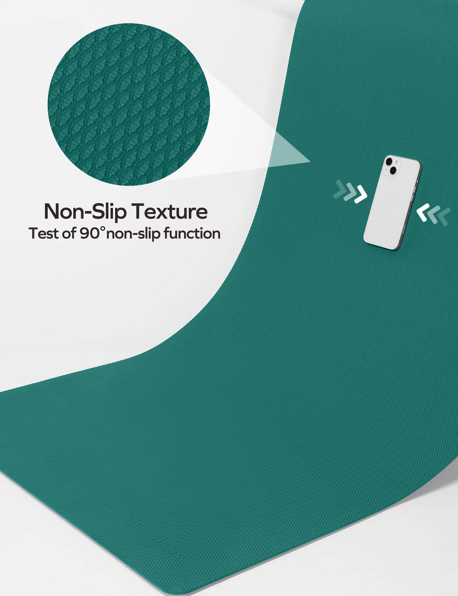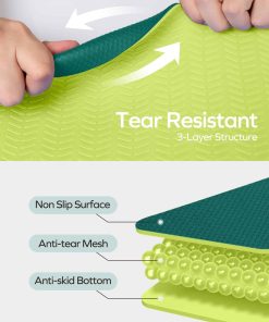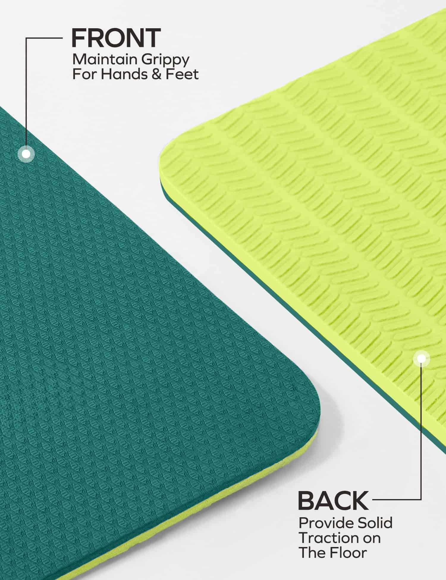 4. Superficie Texturizada Antideslizante de TPE: La capa superior ofrece un excelente agarre para un rendimiento óptimo, mientras que la parte inferior con patrón de neumático asegura que se mantenga firmemente en su lugar en el suelo. Este tapete de yoga de doble capa combina perfectamente funcionalidad y comodidad, convirtiéndolo en un tapete de ejercicio ideal para uso en casa también.