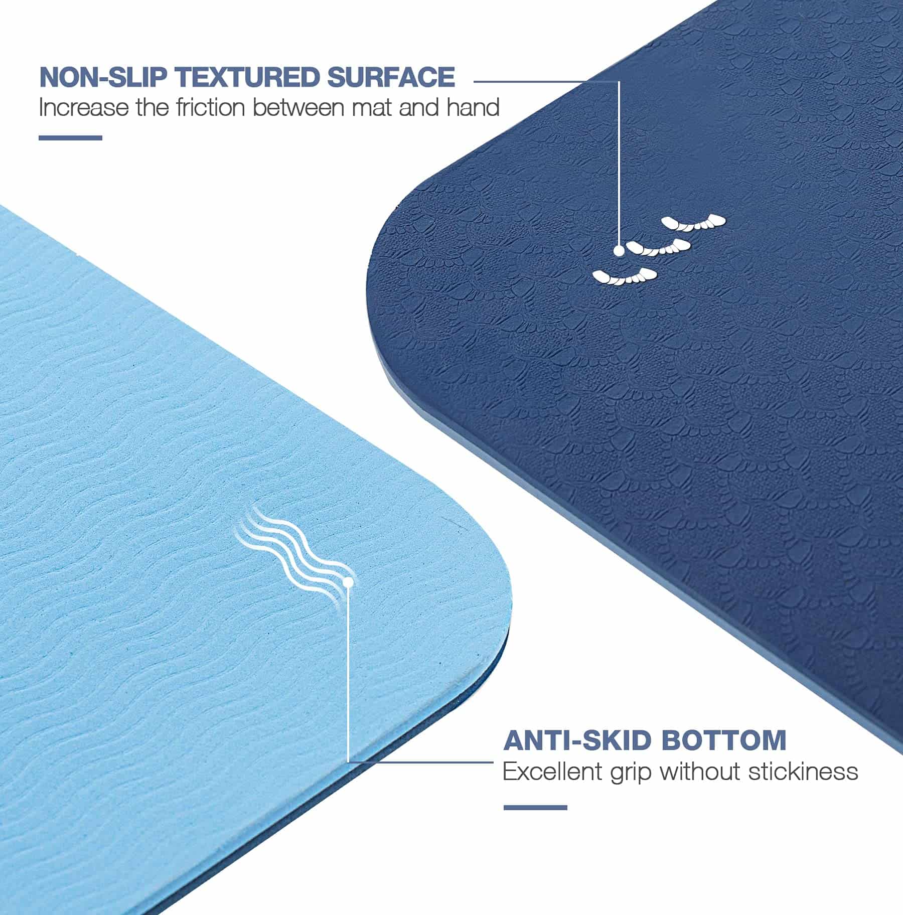 2. DISEÑO DE DOBLE ANTIDESLIZANTE: Este tapete de ejercicios tiene superficies de doble lado antideslizantes. Los bordes ondulados proporcionan una excelente tracción en el suelo. Se desenrolla bastante plano y permanece en su lugar. La superficie texturizada especial evita que tus manos y pies se deslicen cuando sudas en él.