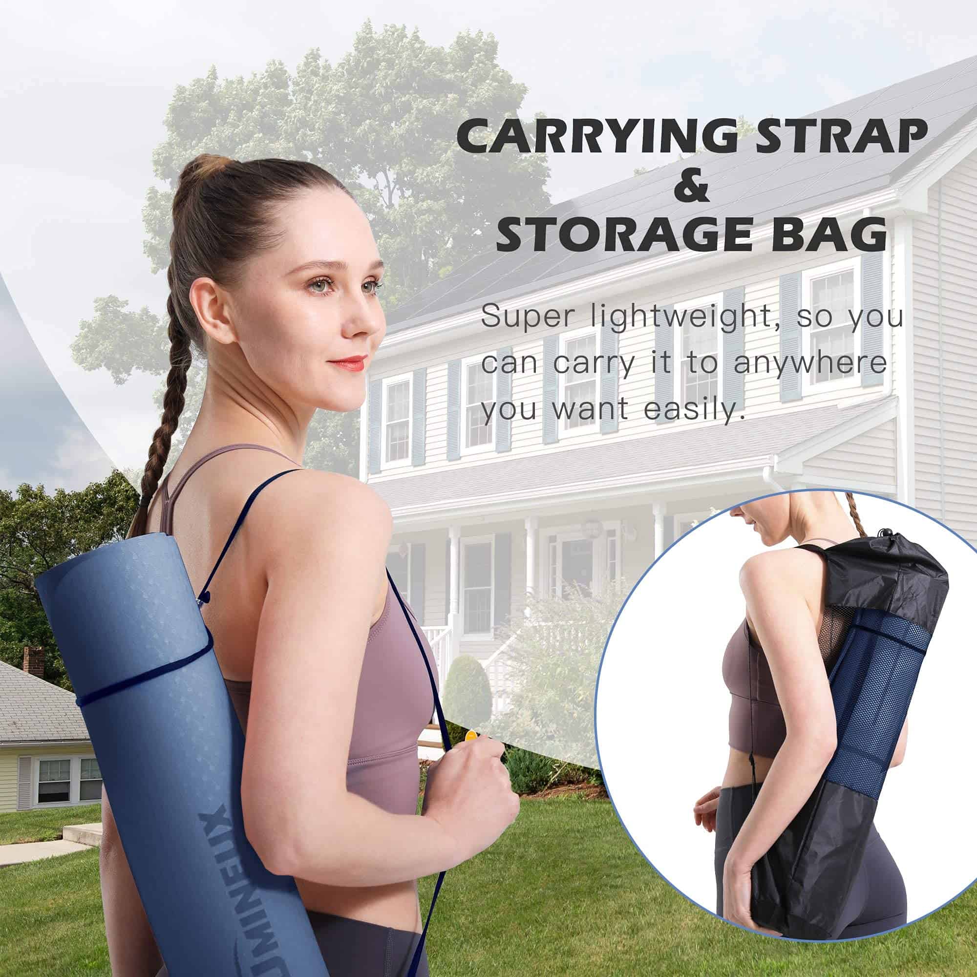 4. INCLUYE BANDOLERA Y BOLSA DE ALMACENAMIENTO GRATIS: No es necesario comprar una correa adicional para llevar el yoga ni una bolsa. Como el tapete de yoga es ligero (2.6 libras), puedes llevarlo fácilmente con la bandolera y la bolsa de almacenamiento gratuitas.