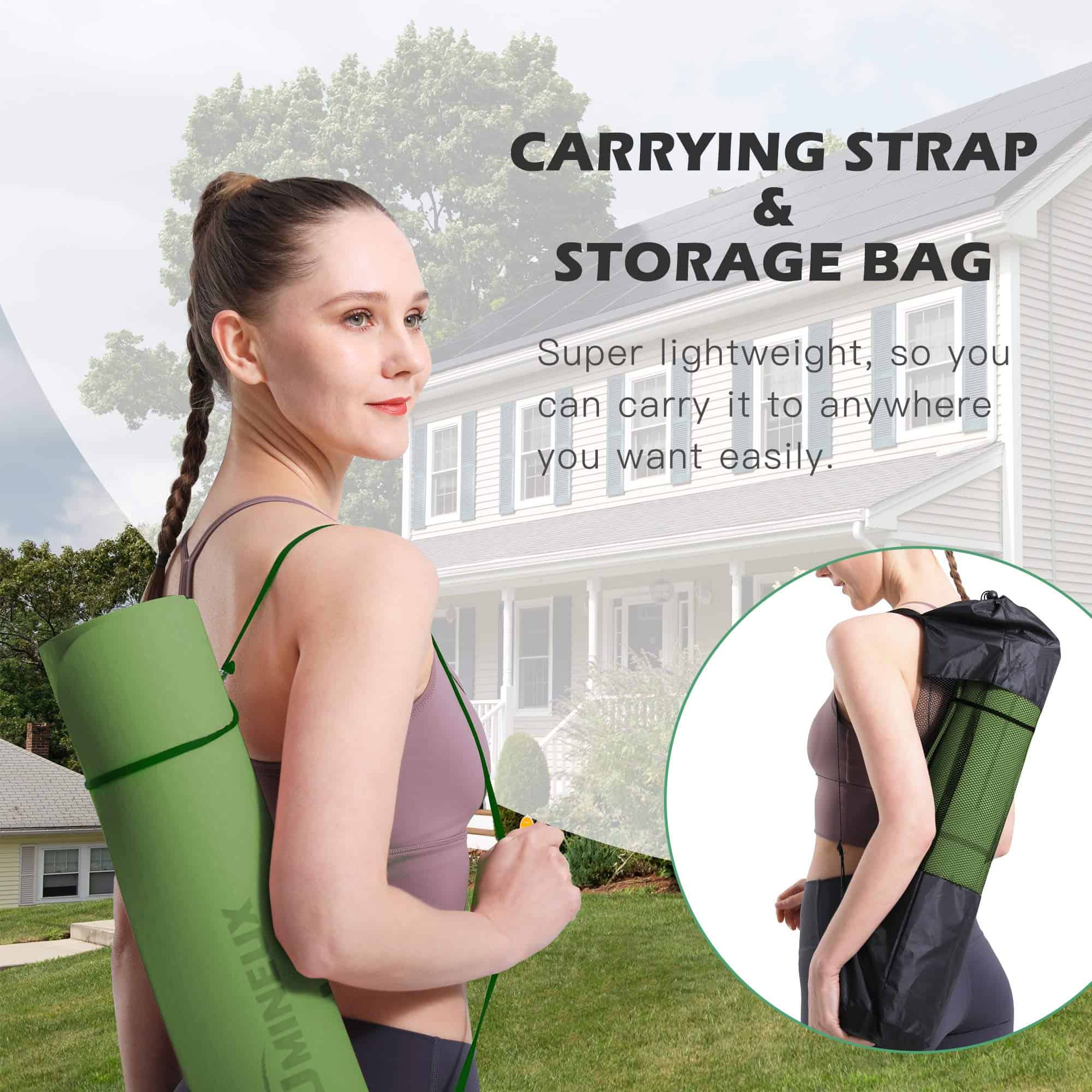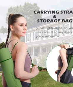 4. BANDOLERA DE TRANSPORTE GRATUITA Y BOLSA DE ALMACENAMIENTO – No necesitas comprar una correa de transporte de yoga y una bolsa extra. Como el tapete de yoga es ligero (2.6 libras), puedes llevarlo fácilmente con la bandolera y la bolsa de almacenamiento gratuitas.