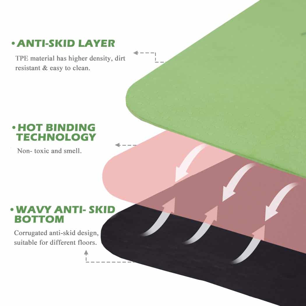2. DISEÑO DOBLE ANTIDESLIZANTE – Este tapete de ejercicio tiene superficies antideslizantes en ambos lados. Los fondos ondulados ofrecen una excelente tracción en el suelo. Se desenrolla bastante plano y se mantiene en su lugar. La superficie texturizada especial evita que tus manos y pies se deslicen cuando sudas sobre él.