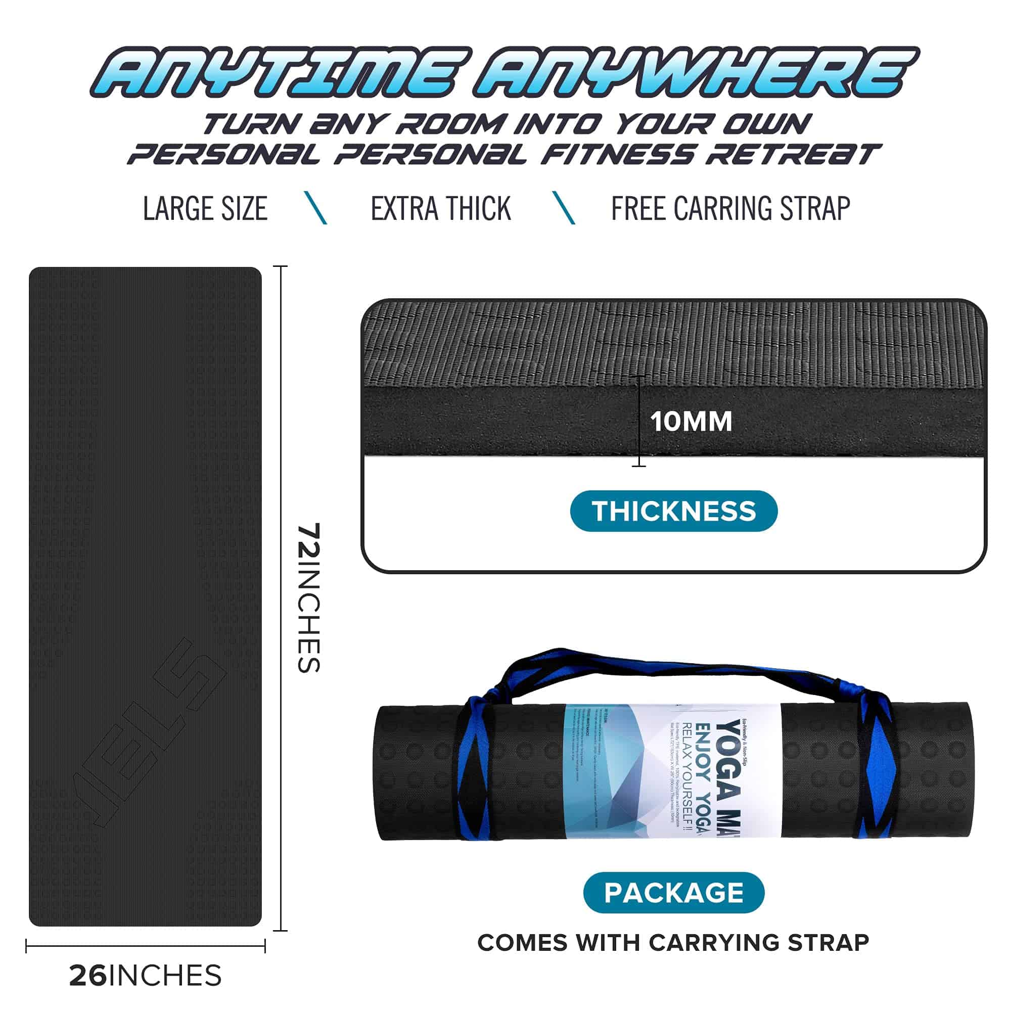 1. TAPETE DE EJERCICIO EXTRA GRUESOJELS tapete de yoga TPE extra grueso de 2/5 pulgadas (10 mm), el tapete es 2 veces más grueso que un tapete de yoga promedio – 2/5 pulgadas de grosor. Este tapete de ejercicios es perfecto para aquellos que necesitan un poco de amortiguación adicional para proteger las articulaciones y agregar comodidad.