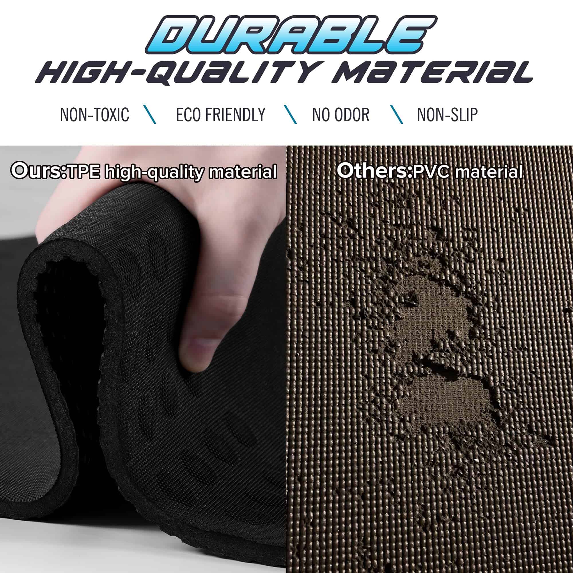 3. TAPETE DE EJERCICIO TPE LIBRE DE PVCEl acolchado está hecho de material TPE certificado por SGS, porque proporciona un 50% más de amortiguación que los materiales comunes (EVA, PVC y NBR), y además tiene las ventajas de ser no tóxico, insípido, antideslizante, duradero y resistente a las roturas. Es la mejor opción para una nueva generación de tapetes de yoga. Se puede utilizar de forma segura por toda la familia.
