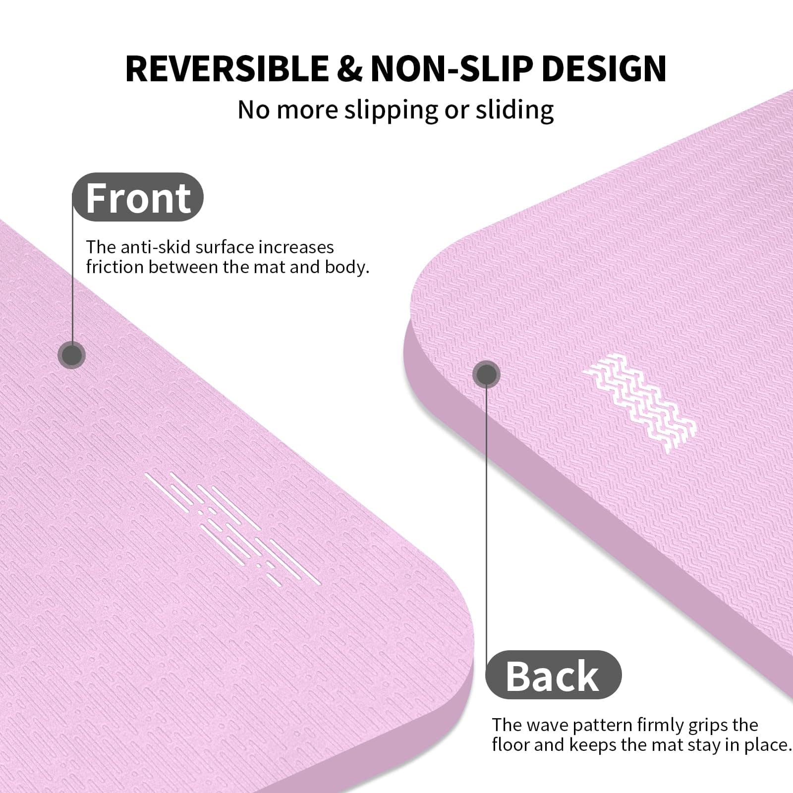 4. Diseño antideslizante y reversible: La superficie antideslizante aumenta la fricción entre el tapete y el cuerpo, evitando que tus manos, rodillas y pies resbalen durante la práctica. Los patrones ondulados en la parte trasera se adhieren firmemente al suelo para asegurar que el tapete se mantenga en su lugar.