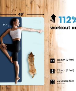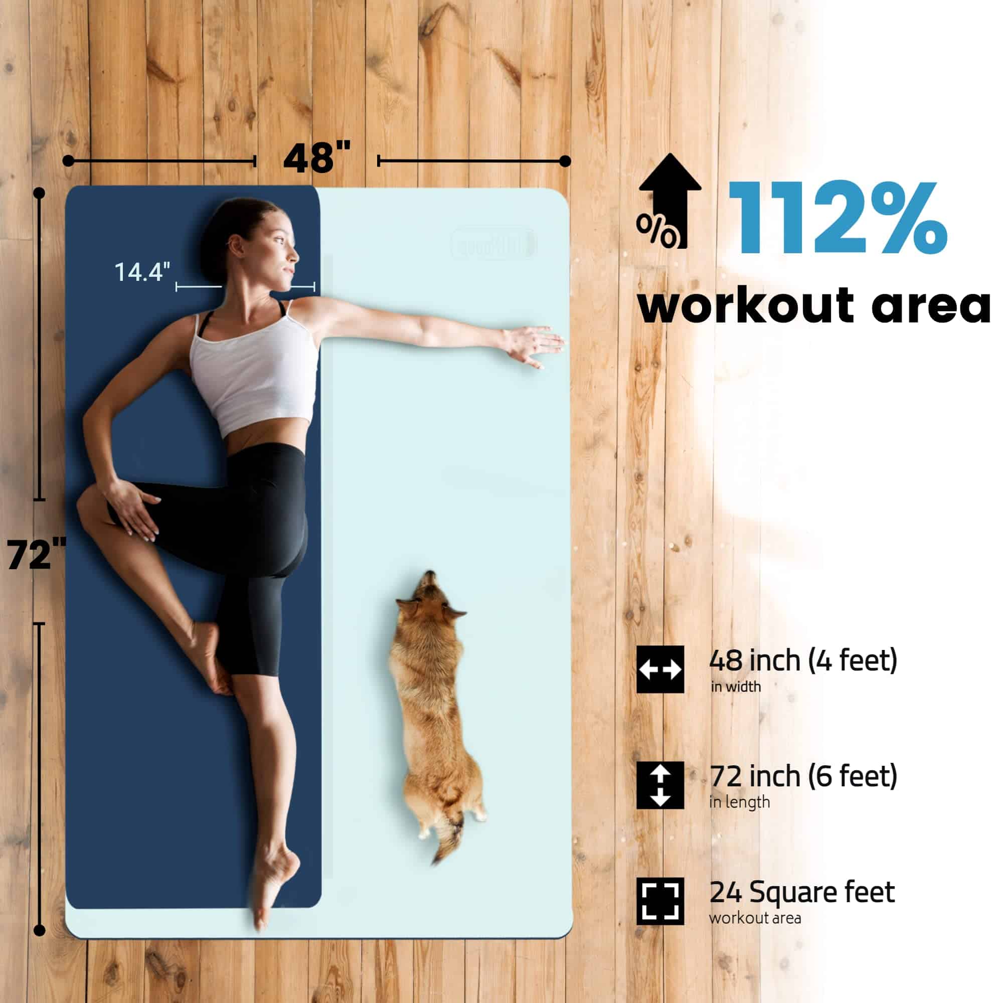 1. Amplíe su espacio de entrenamiento Con 72 x 48 pulgadas, nuestro tapete de ejercicio para entrenamiento en casa ofrece un 112% más de espacio de ejercicio que los tapetes tradicionales. Perfecto para fitness en casa, le brinda la libertad de moverse sin sentirse confinado.