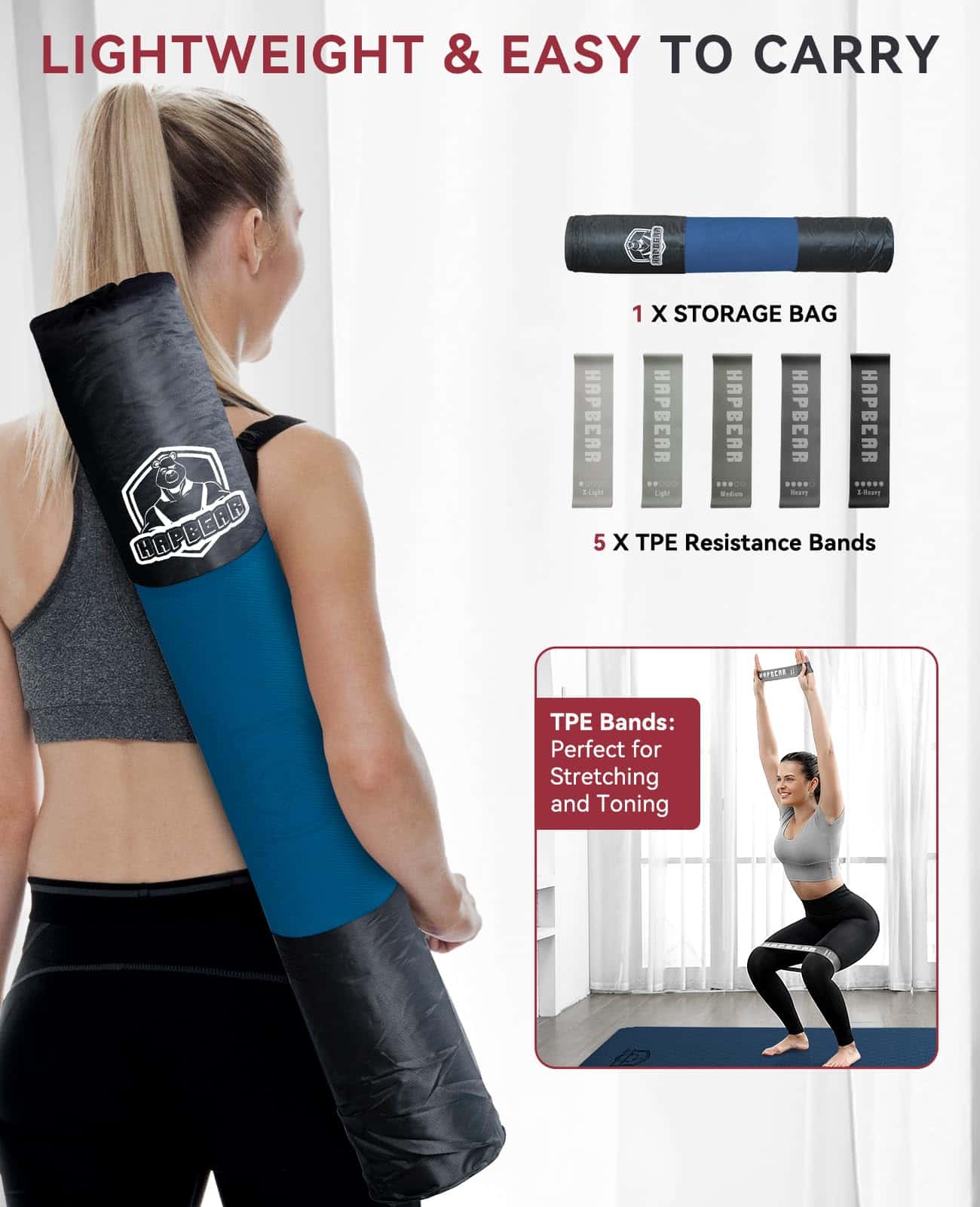 5. Este tapete de yoga para entrenamiento en casa viene con una bolsa de transporte y bandas de resistencia de regalo, lo que facilita llevar tu tapete a cualquier lugar. Ligero y portátil, es un compañero ideal para sesiones en casa, en el gimnasio o al aire libre, brindándote flexibilidad para los entrenamientos dondequiera que vayas.