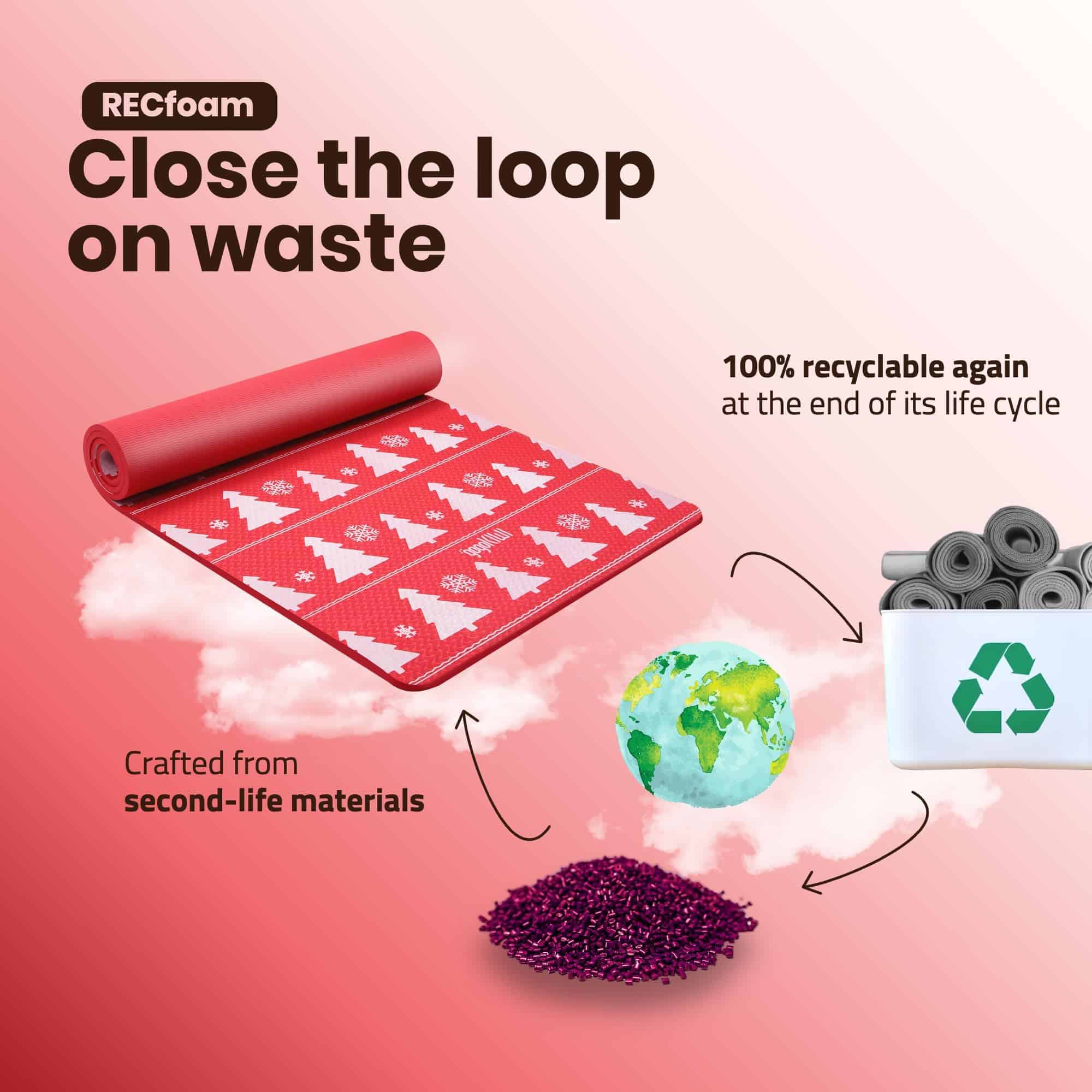 2. Reciclado y reciclable nuevamente Hecho de RecFoam premium 100% reciclable, nuestro tapete de ejercicio grueso para entrenamiento en casa es amigable con el medio ambiente. ¡Haz ejercicio con la tranquilidad de saber que no estás dañando el planeta!