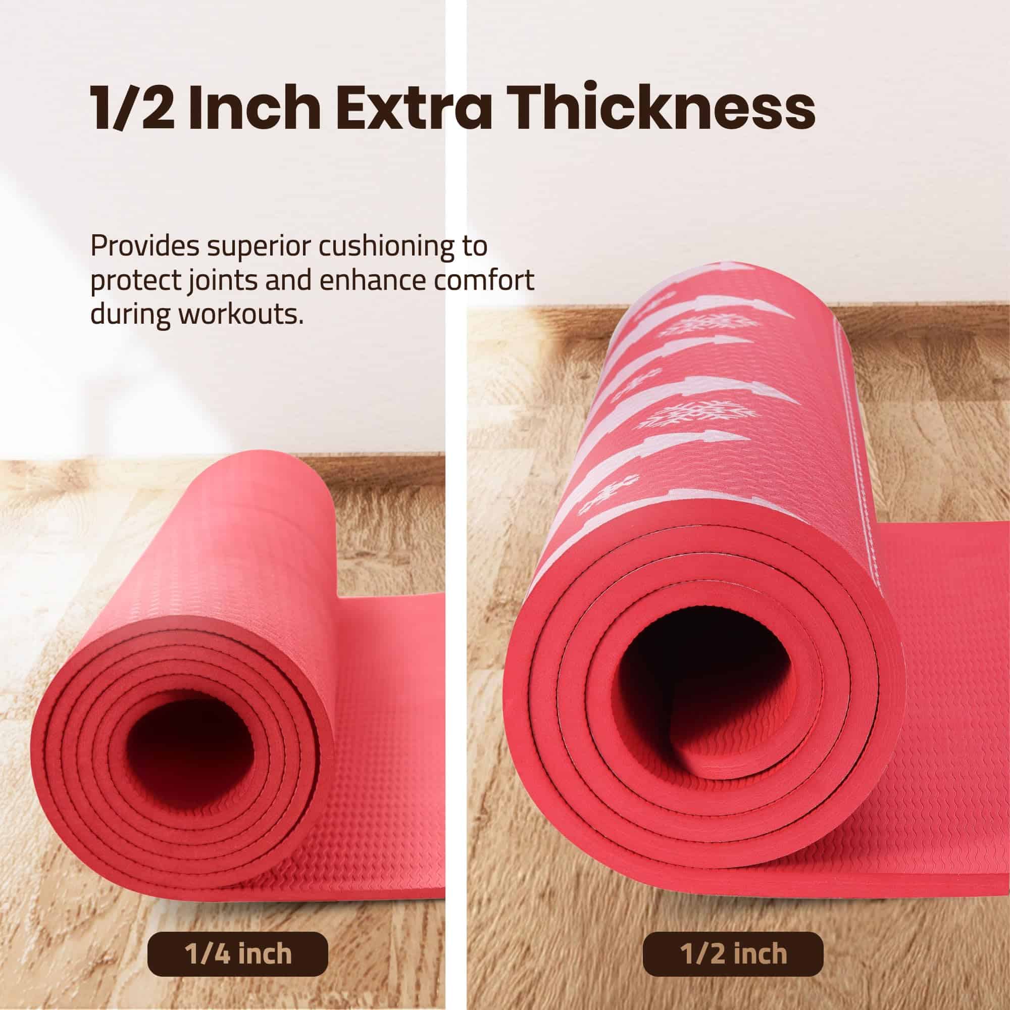1. Espesor extra para mayor comodidad Nuestros tapetes de yoga extra gruesos para entrenamiento en casa tienen 1/2 pulgada de espesor, brindando un excelente soporte y comodidad durante tus entrenamientos. ¡Di adiós al dolor de rodillas, espalda o codos tocando el suelo!