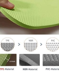 2. Material ecológico TPE: Más costoso pero vale la pena. El TPE es la última mejora tecnológica de los tapetes de yoga tradicionales. Nuestros tapetes están hechos de material TPE certificado por SGS que es antideslizante, fácil de limpiar, sin olor y excelente en amortiguación, a diferencia de esos baratos y tradicionales. Son verdaderamente ecológicos y saludables.