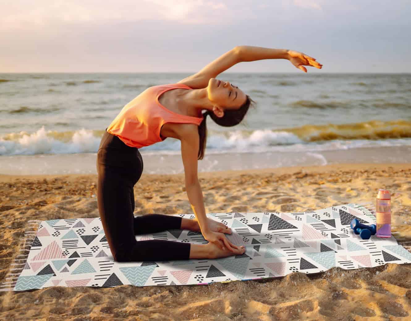 Hecho de algodón premium ecológico, este tapete es absorbente, a prueba de arena y se seca rápidamente, lo que lo convierte en un compañero ideal para clases de yoga calientes y sudorosas. Además, su tejido superior de algodón y materiales reciclables le dan una estructura resistente y un agarre excepcional para evitar resbalones.