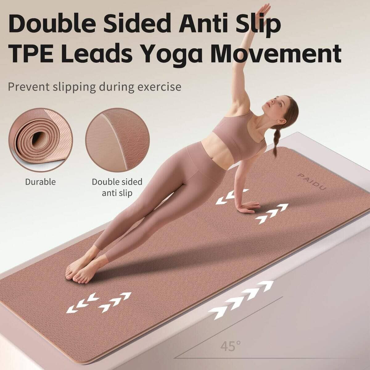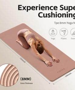 Tapete de Yoga PAIDU fabricado con un material TPE superior, completamente libre de PVC, látex y productos químicos dañinos. No solo es suave para la piel, sino también una elección respetuosa con el medio ambiente, perfecto para aquellos que se preocupan por su salud y el entorno. Con un tamaño generoso y un diseño ultra grueso de 0,3 pulgadas, este tapete de yoga ofrece un amplio espacio para diversas posturas y proporciona una amortiguación excepcional. Las superficies antideslizantes en ambos lados garantizan estabilidad y equilibrio para mujeres y hombres, y el material de POE de alta calidad asegura mejor resiliencia y anti-fatiga. A pesar de su grueso acolchado, el tapete es sorprendentemente ligero y viene con una correa de transporte conveniente. Fácil de enrollar y llevar al estudio, gimnasio e incluso de viaje, para que puedas disfrutar de tu entrenamiento en cualquier lugar, en cualquier momento. Limpiar el tapete es sencillo, simplemente límpialo con un paño húmedo y jabón suave después de cada uso. Su material duradero resiste manchas y olores, manteniendo su frescura y rendimiento con el tiempo.