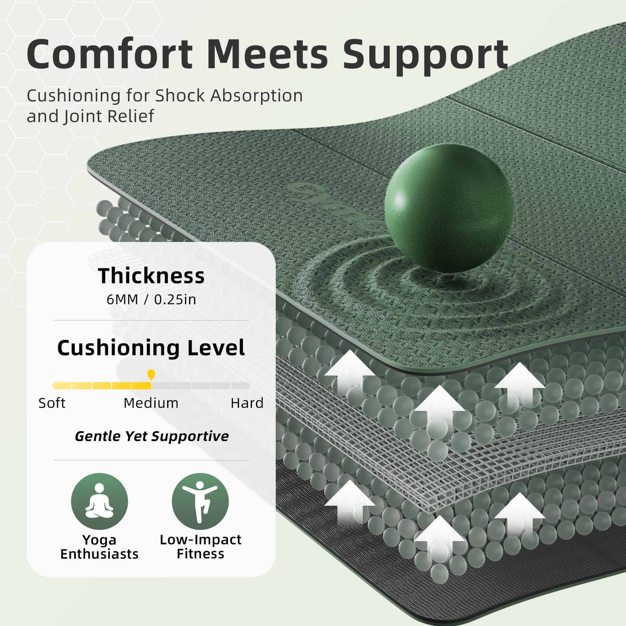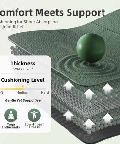 3. 1/4″ de Grosor para Protección Articular Acolchada: Construido con materiales de alta densidad y 6 mm de amortiguación de apoyo, este tapete ayuda a reducir la presión en tus rodillas, codos y columna, ideal para sesiones más largas y rutinas de alto impacto.