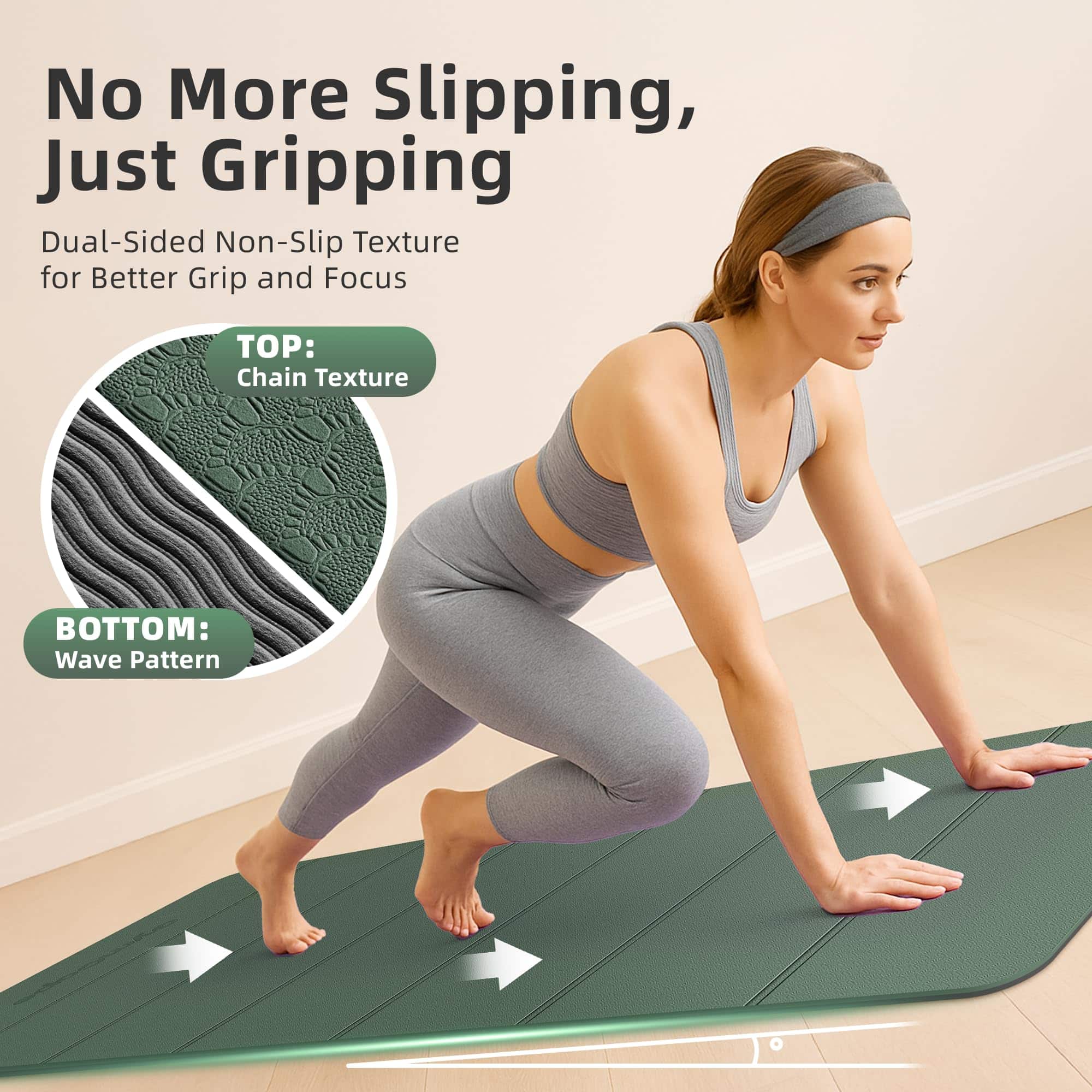 2. Estabilidad Mejorada con Superficie de Doble Textura Antideslizante: Diseñado con una parte superior texturizada en cadena y una parte inferior con patrón de onda, este tapete ofrece tracción superior en cualquier superficie. Ya sea que estés haciendo HIIT o practicando yoga en el parque, mantente estable y seguro con cada movimiento.