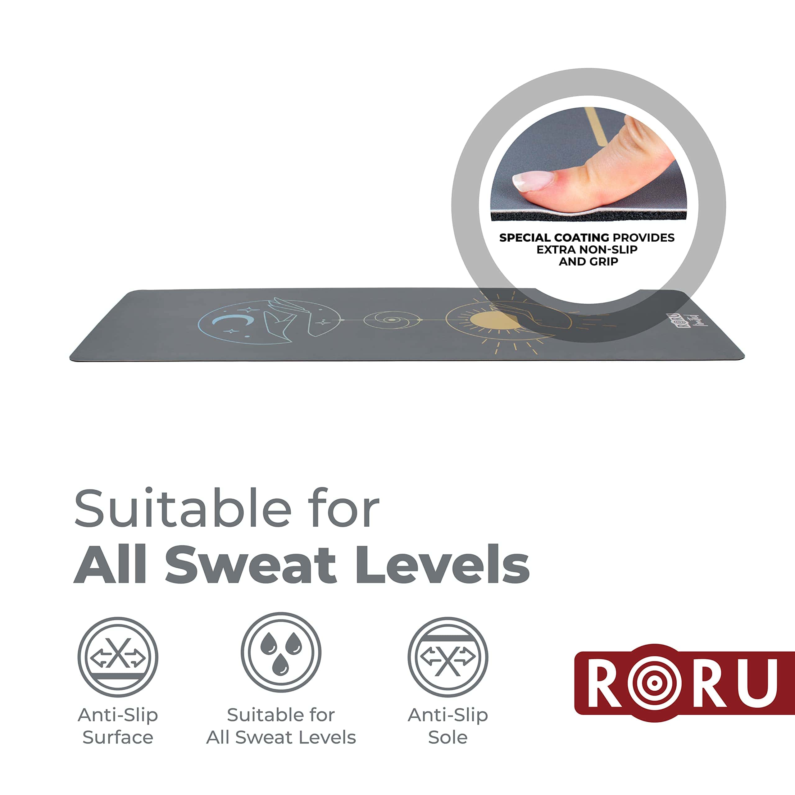 2. AMIGABLE CON EL YOGA Y LA INFRAESTRUCTURA: Los Tapetes de Yoga RORU Sun Series están diseñados especialmente para los yoguis que tienen problemas de deslizamiento en el tapete con su característica antideslizante.
