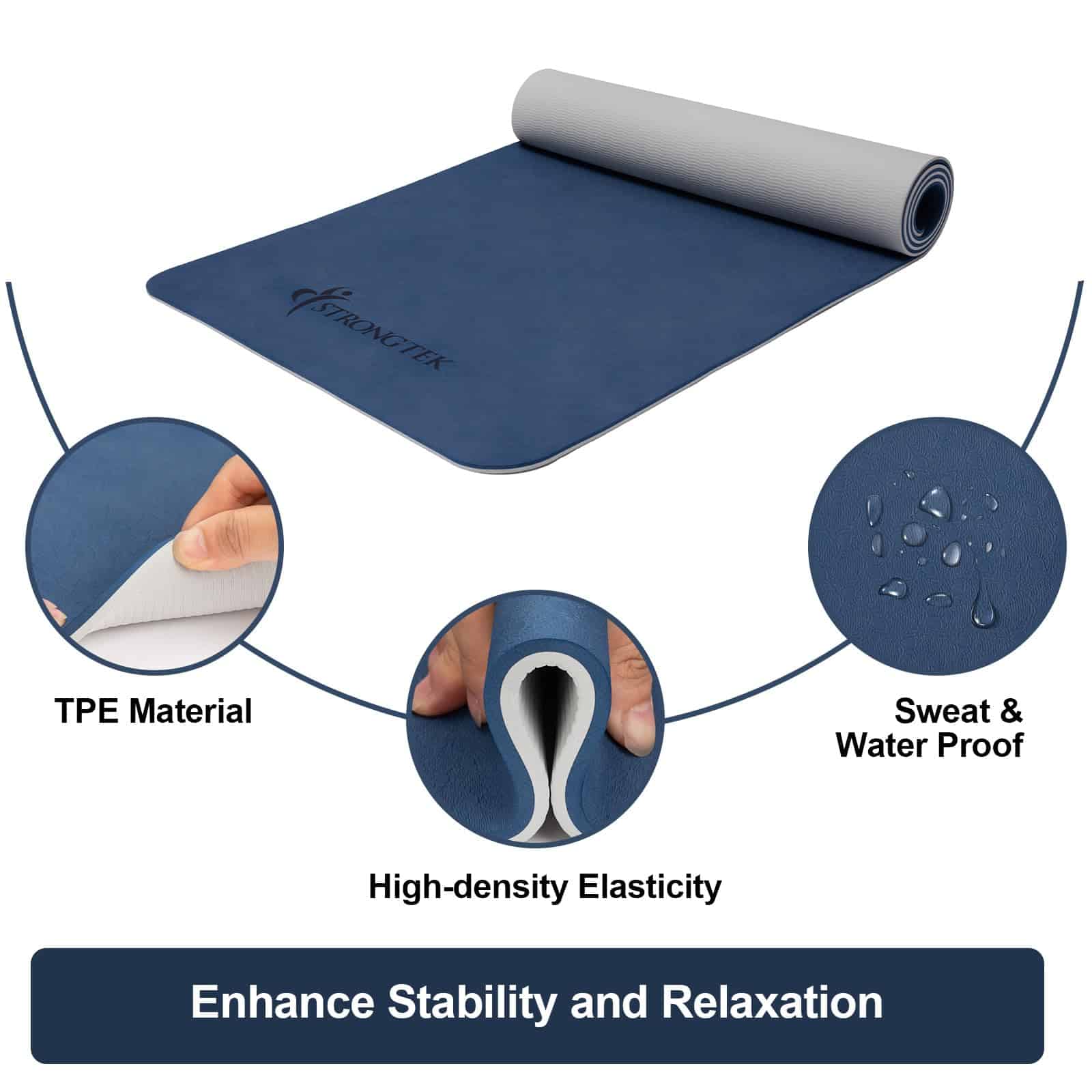 2. Superficie Antideslizante Confiable: La capa superior de TPE ligeramente texturizada proporciona un excelente agarre para evitar resbalones, ideal para estiramientos lentos, posturas de equilibrio y entrenamientos dinámicos por igual.