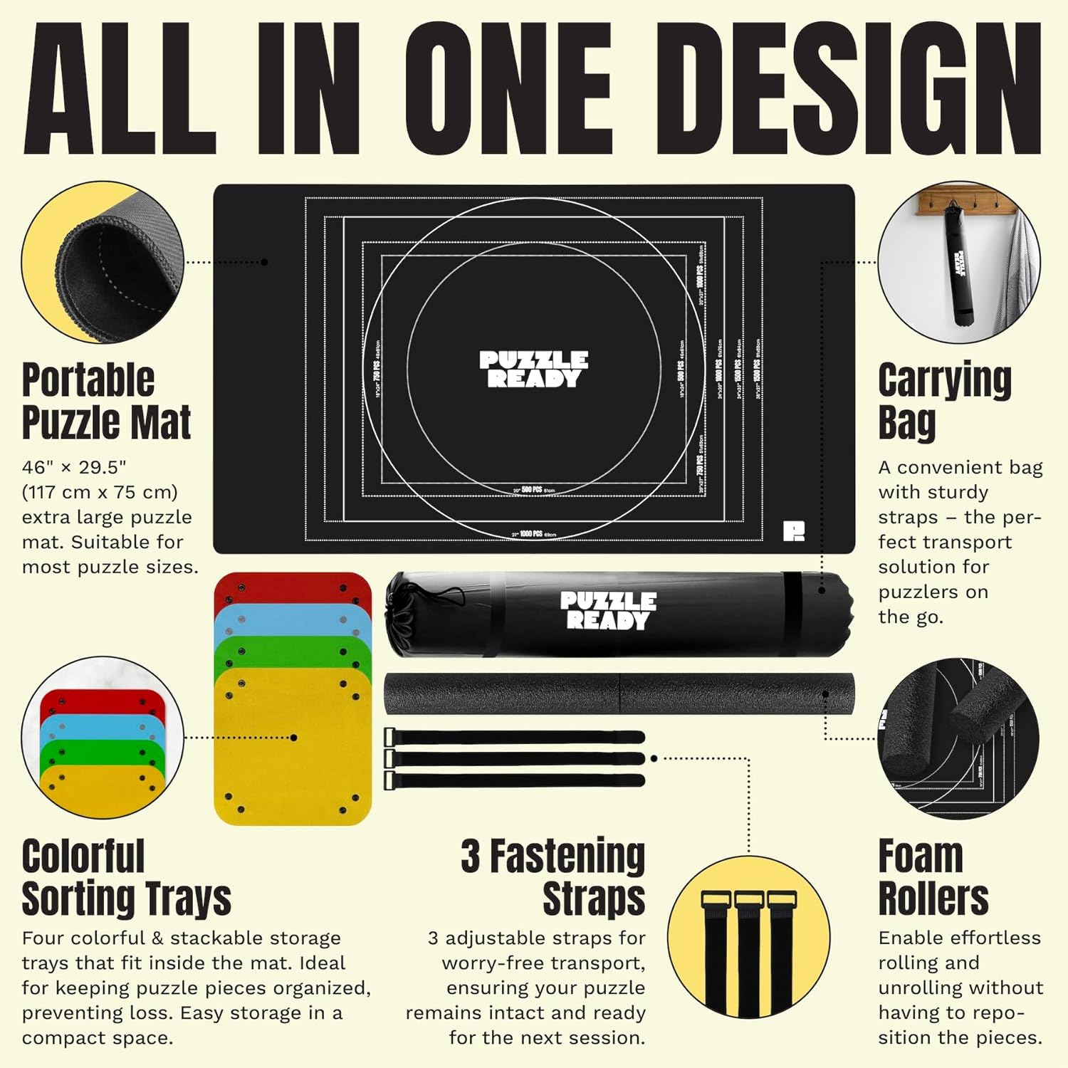 2. Diseñado para amantes de los rompecabezas: Nuestro Tapete de rompecabezas enrollable es una solución todo en uno. Recibirá un Tapete de rompecabezas de 46 x 29,5 pulgadas que encaja fácilmente en rompecabezas de 500, 750, 1000 y 1500 piezas, rodillo de espuma, 3 correas de velcro, 4 bandejas de clasificación de rompecabezas y bolsa de almacenamiento de Tapete de rompecabezas. Nuestro Tapete de rompecabezas también está diseñado para rompecabezas redondos de 500 y 1000 piezas.