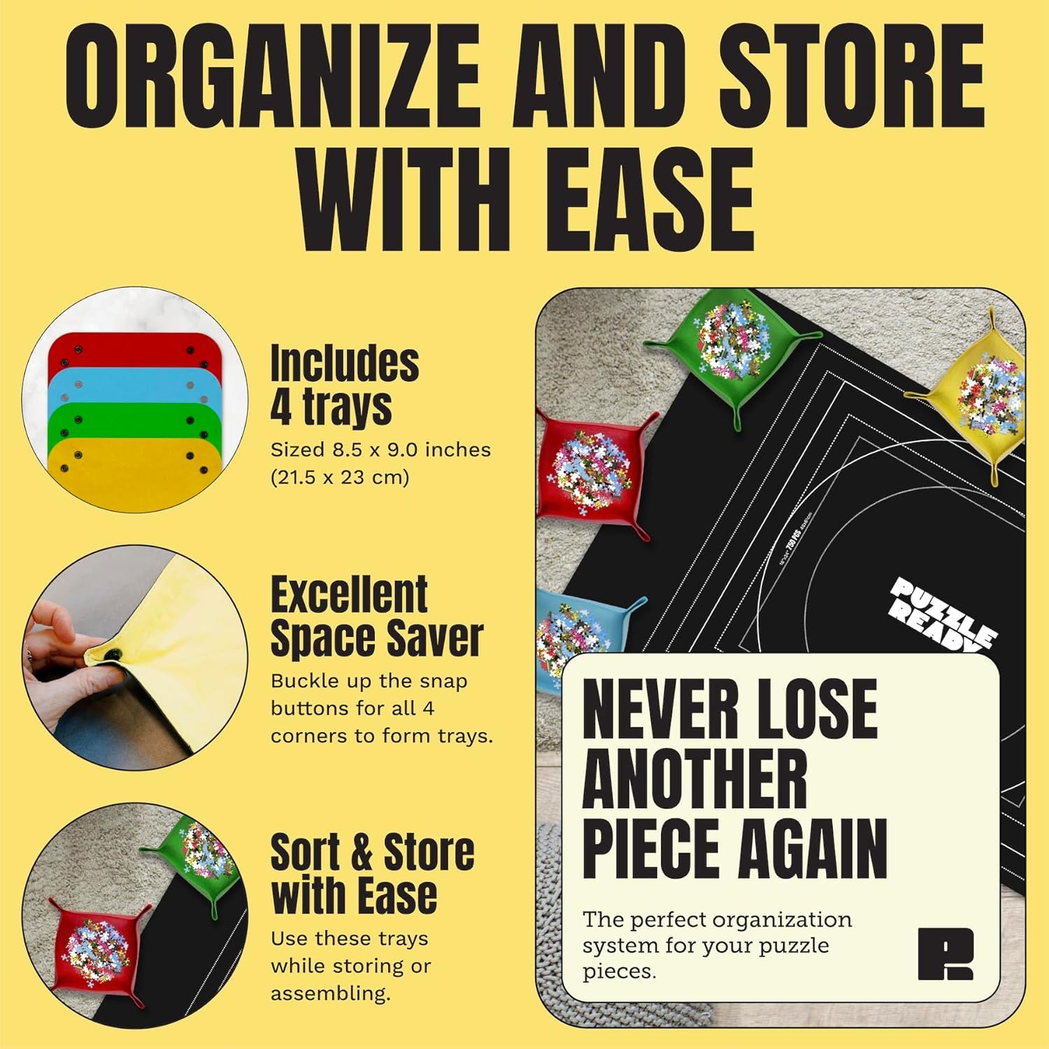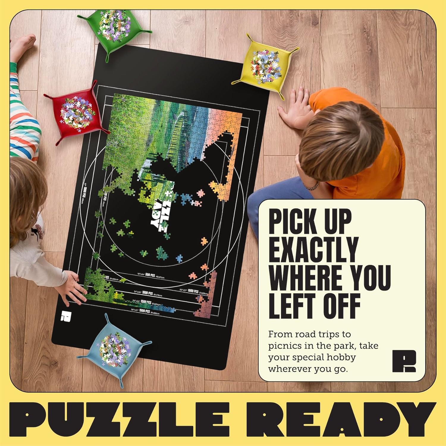 4. ¿Por qué elegir los accesorios de rompecabezas de Puzzle Ready? Amamos los rompecabezas y queremos ayudarte a tener la mejor experiencia de rompecabezas posible. Reconocemos lo difícil que es dejar un buen rompecabezas a medio hacer, pero a veces simplemente necesitas dejar ese rompecabezas a un lado por unos momentos o días y volver a él en una fecha posterior. ¿Quiere algo más resistente? Eche un vistazo a nuestro Puzzle Board & Puzzle Caddy disponibles para rompecabezas de 1000 y 1500 piezas.