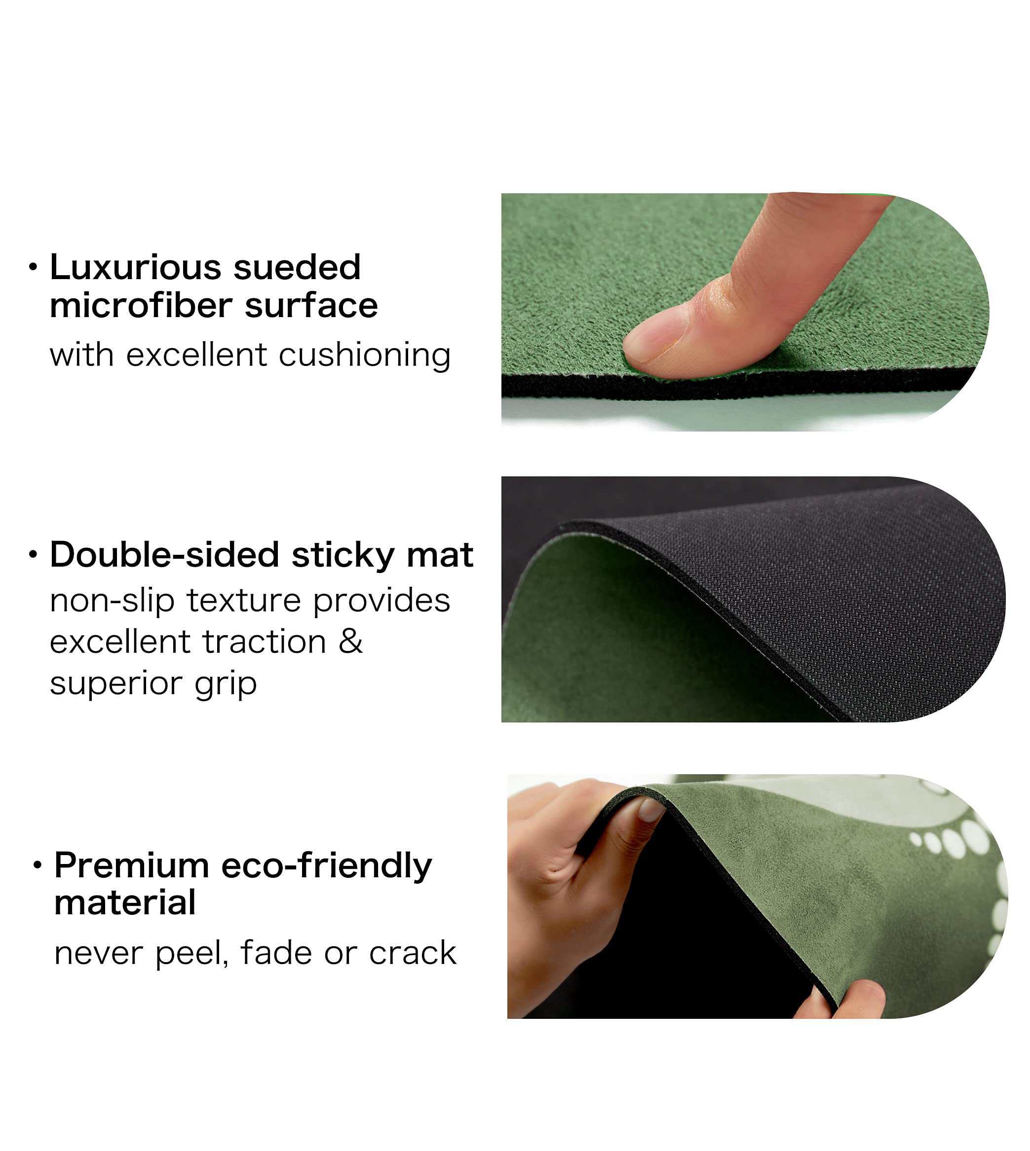 4. Excelente amortiguación: con 3.5mm de grosor y material de gamuza sintética, protegiendo la seguridad de todos los niveles de entusiastas del yoga. Te permite mantener el equilibrio durante cualquier estilo de ejercicio. Resistente a la humedad hace que el tapete sea fácil de lavar con agua y jabón. Limpie las manchas con un paño húmedo, agua fría y detergente suave, y luego séquelo al aire. Por favor, no lo exponga directamente al sol.