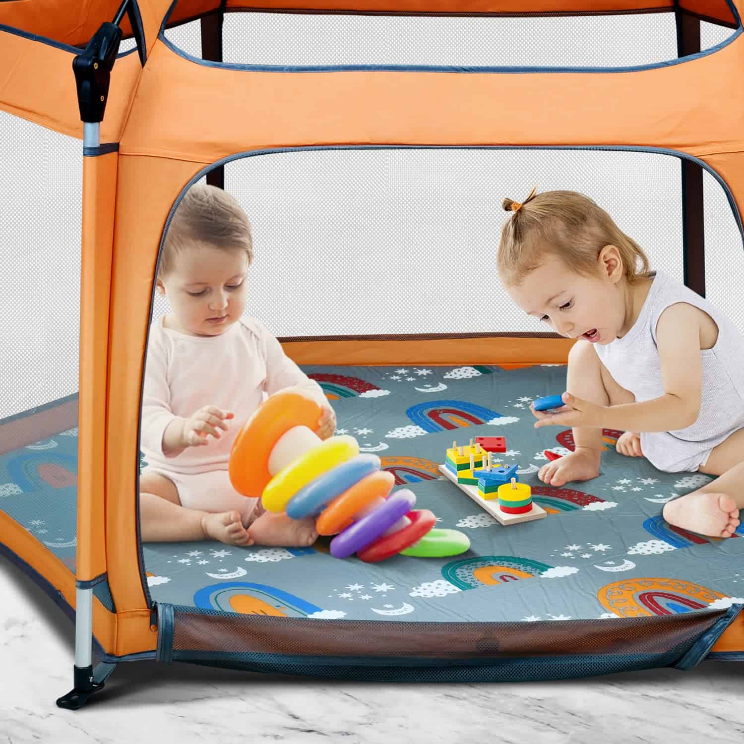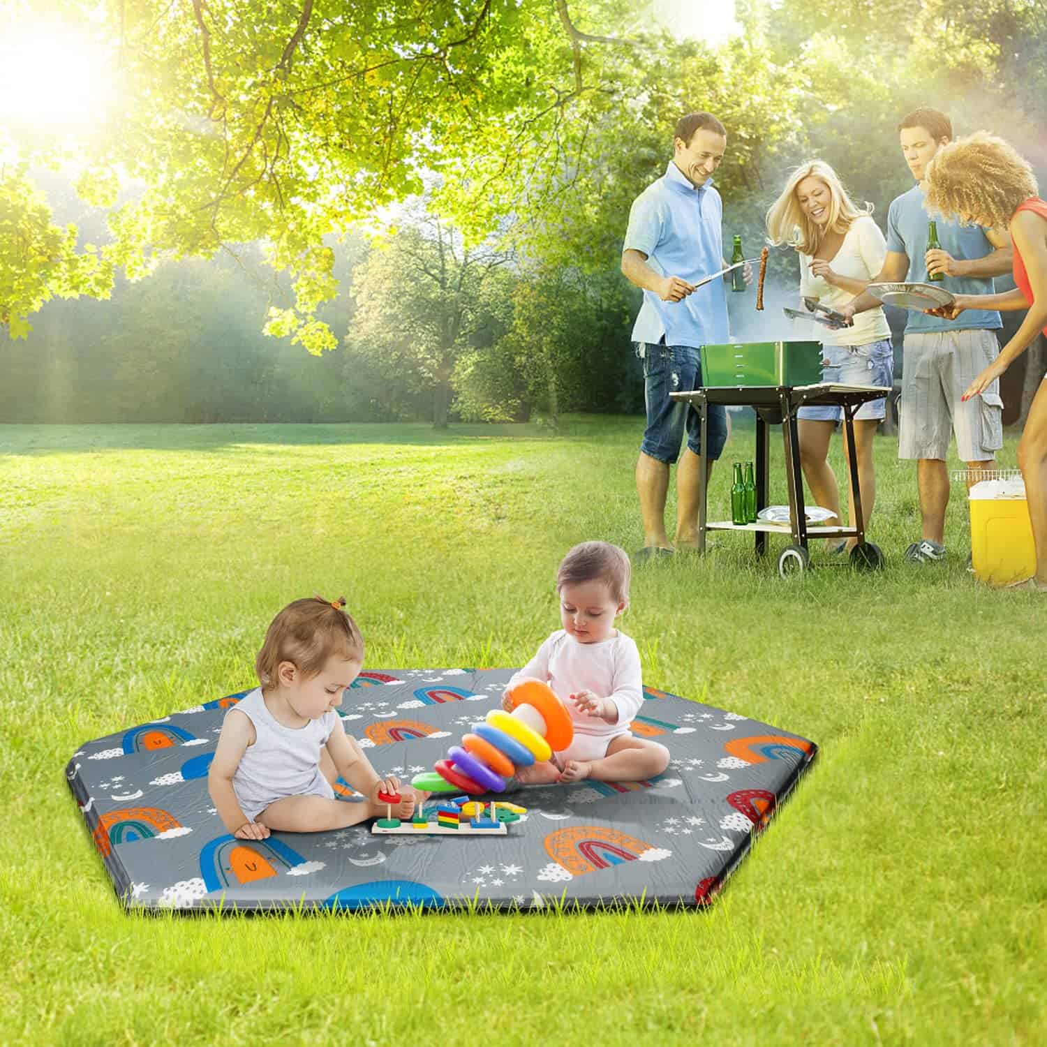 1. Ajuste perfecto: Este tapete hexagonal para corralito de 59″ es compatible con el corralito para bebé POP ‘N GO y cualquier otro corralito hexagonal de 59 pulgadas.