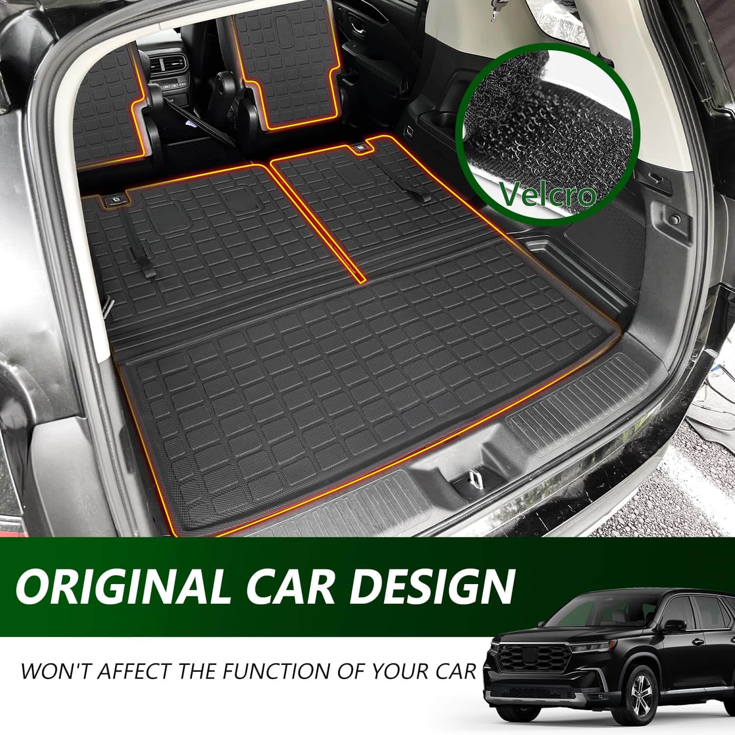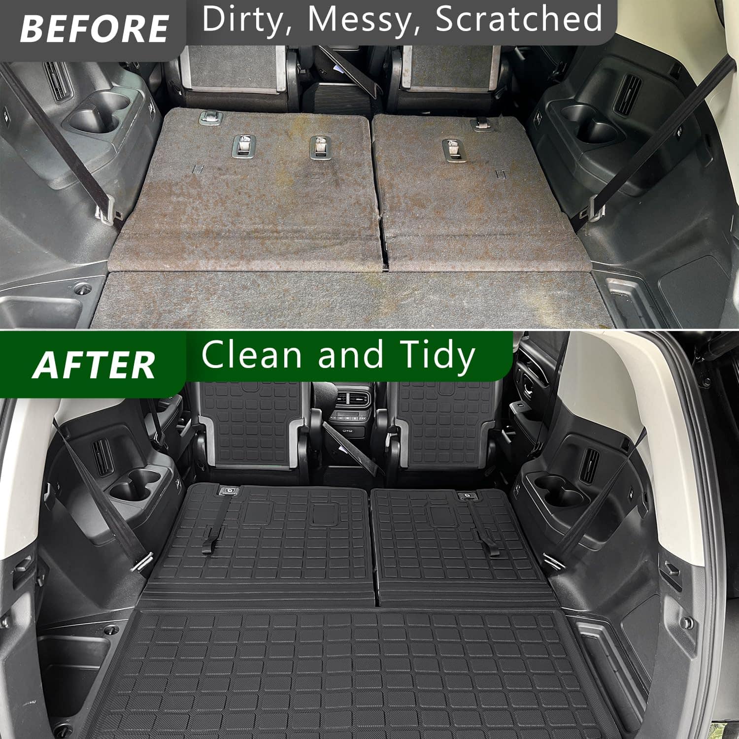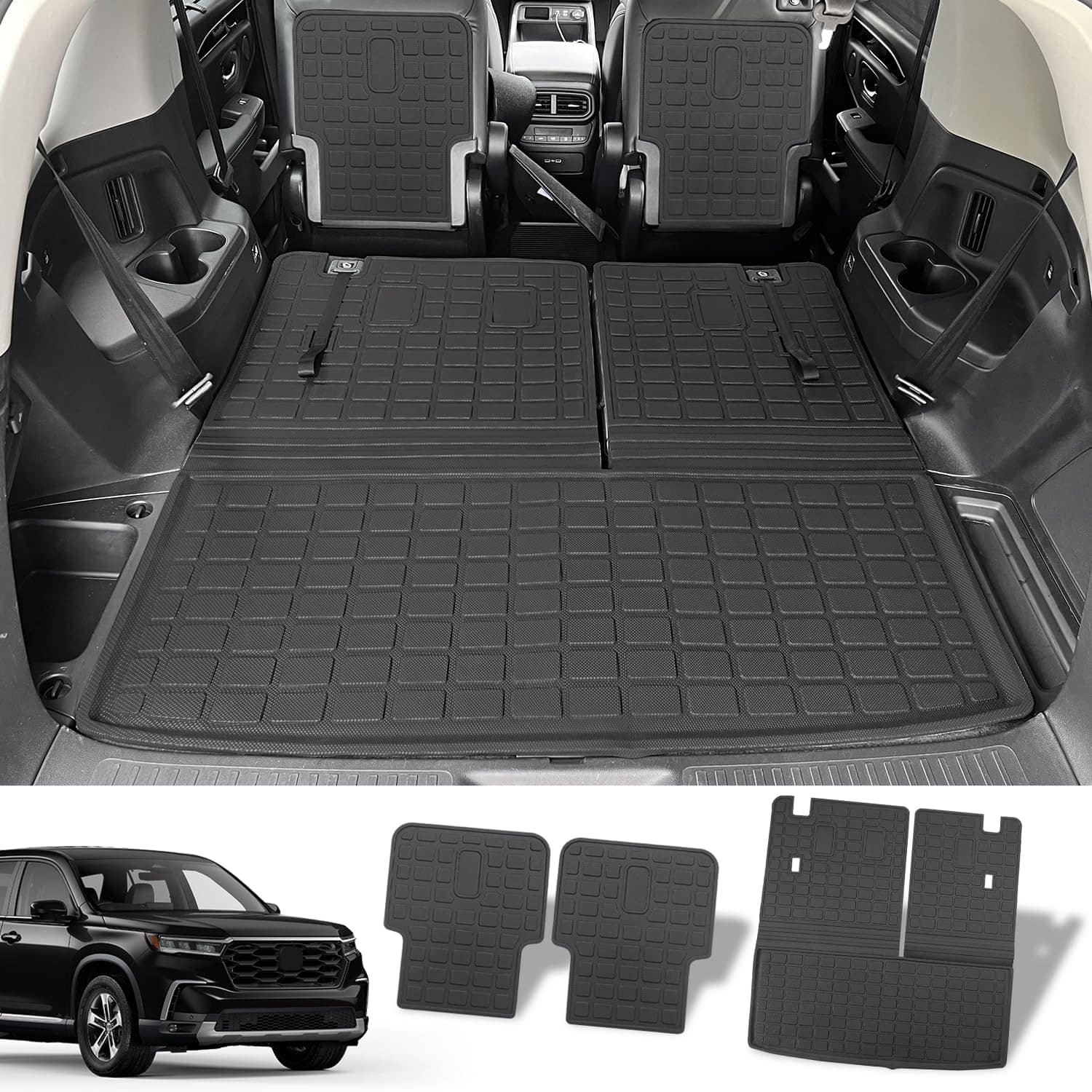 Exclusive Fitment: Our cargo liner with backrest mat is compatible with 2023 2024 Honda Pilot behind the 3rd row seats. And the 2nd backrest mat is compatible with the second row seats. High-Quality Material: The cargo liner and backrest mats replacement for Honda Pilot are made of high quality TPE material. They have no bad smell. They have good flexibility. Function: The cargo mat will protect your car from scratch. The items on the trunk will not slide away. The replacement for Honda Pilot backrest mats will protect the back of the seats well. Easy to Install: Compatible with Honda Pilot backrest mats are with velcro. You just need to take the cargo mat from the package and put it in the correct place. The whole process will not take so much time. Service and Warranty: We provide you with satisfactory service. If you have any installation problems about the cargo mat, please contact us. We will provide you with after-sales service.