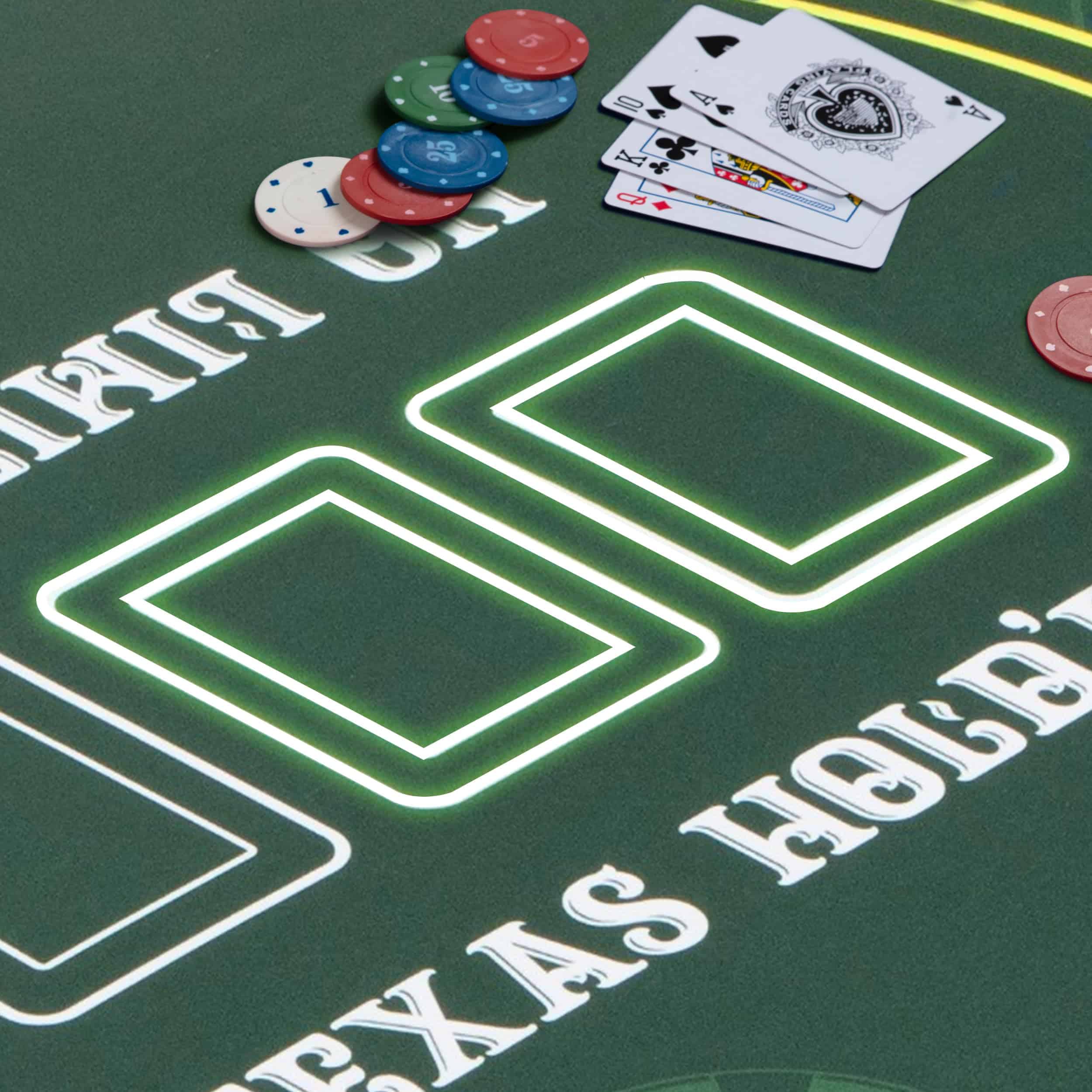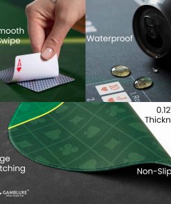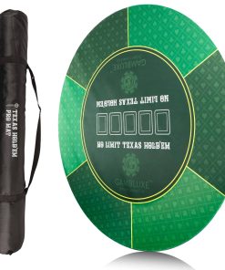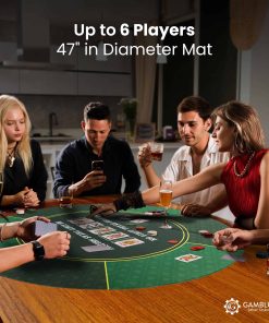 Eleva tus noches de póker a un nivel profesional con nuestro Tapete de Póker Redondo Premium Texas Hold’em de GAMBLUXE. Diseñado para entusiastas del póker, este tapete de mesa de gran calidad está diseñado para mejorar tu experiencia de juego e impresionar a tus invitados. Con dimensiones de 47 x 47 pulgadas, nuestro tapete de mesa de póker de goma de 3 mm acomoda cómodamente hasta 6 jugadores, lo que lo hace ideal para reuniones de todos los tamaños. Ya sea que estés organizando un juego íntimo con amigos o una fiesta de póker más grande, este tapete es perfecto para todos. Montar tu mesa de póker nunca ha sido tan fácil. Nuestro tapete plegable de póker transforma cualquier mesa en una mesa de póker en cuestión de minutos, y es increíblemente portátil y plegable. La bolsa premium de transporte/almacenamiento hace que sea conveniente transportarlo y guardarlo, asegurándote de que puedes disfrutar del póker donde desees. Durante el juego, la parte inferior de goma antideslizante mantiene el tapete firmemente en su lugar, mientras que la superficie lisa permite que las cartas y fichas se deslicen sin esfuerzo, mejorando la experiencia de juego en general. Nuestro cobertor de mesa de póker cuenta con una superficie repelente al agua que es fácil de limpiar, para que puedas disfrutar de tus noches de póker sin preocupaciones. Nuestro tapete de póker tiene costuras duraderas reforzadas en los bordes para garantizar una resistencia duradera, proporcionando una base confiable para innumerables partidas futuras. Diseñado con un elegante color verde, nuestro Tapete de Póker GAMBLUXE no solo cumple con la funcionalidad, también aporta un toque de elegancia y lujo a tus noches de póker. Impresiona a tus invitados y crea un ambiente que recuerda a un entorno de póker profesional. Experimenta la emoción del póker Texas Hold’em directamente en casa con nuestro Tapete Profesional de Póker Texas Hold’em de 47 x 47 pulgadas de GAMBLUXE. No es solo un tapete; es una declaración de tu pasión por el póker. ¡Eleva tu experiencia en las noches de juego hoy!