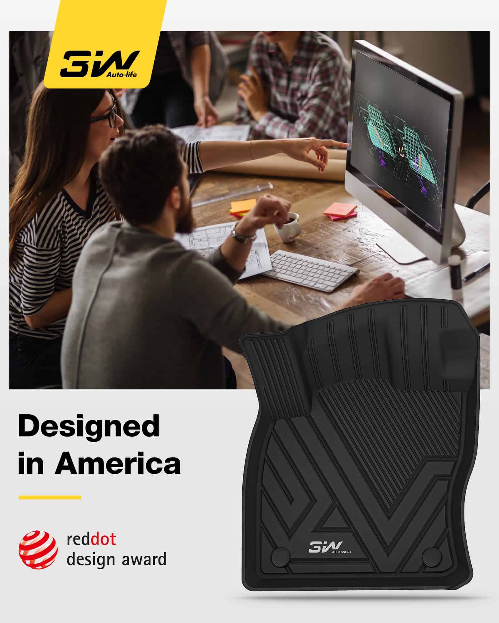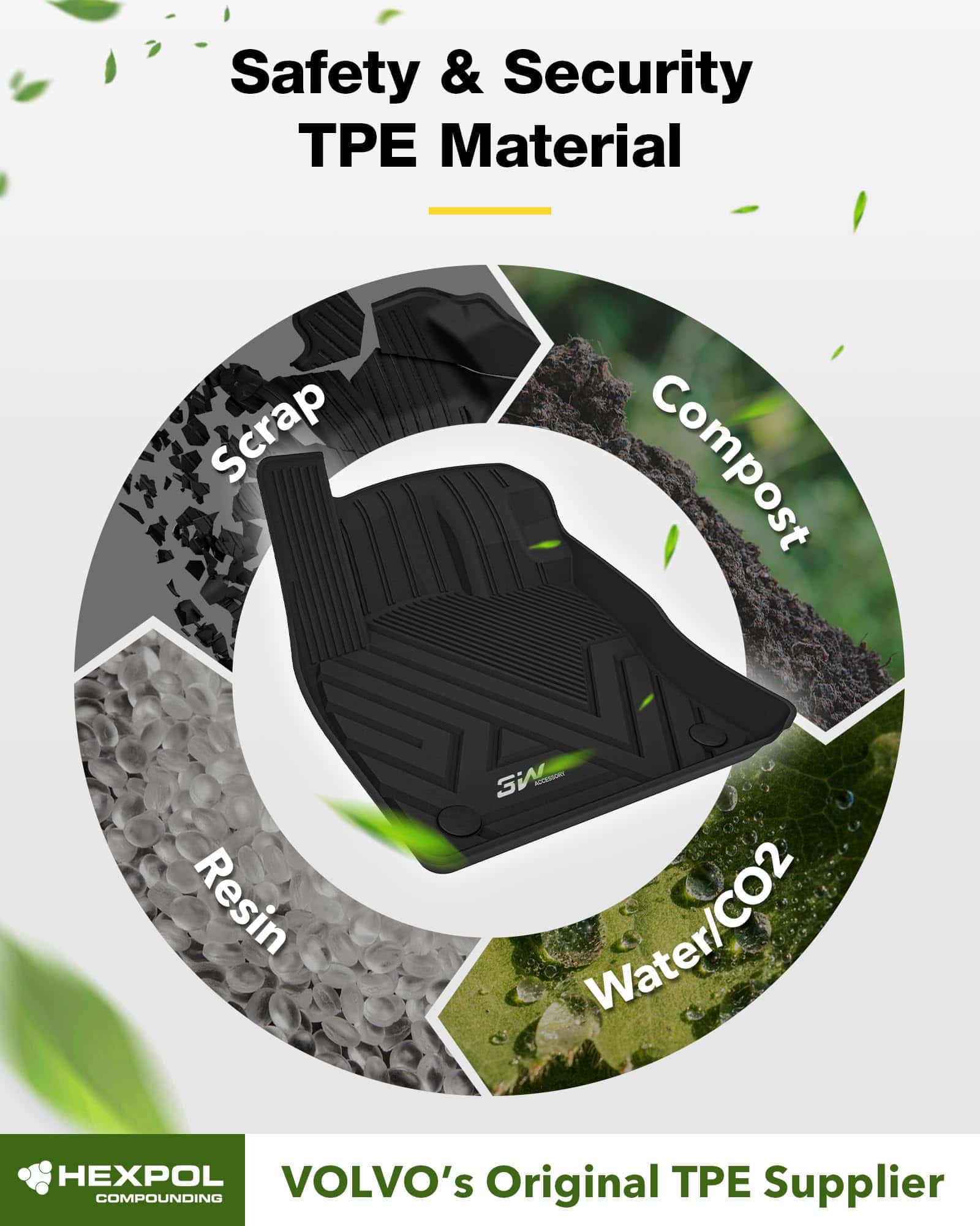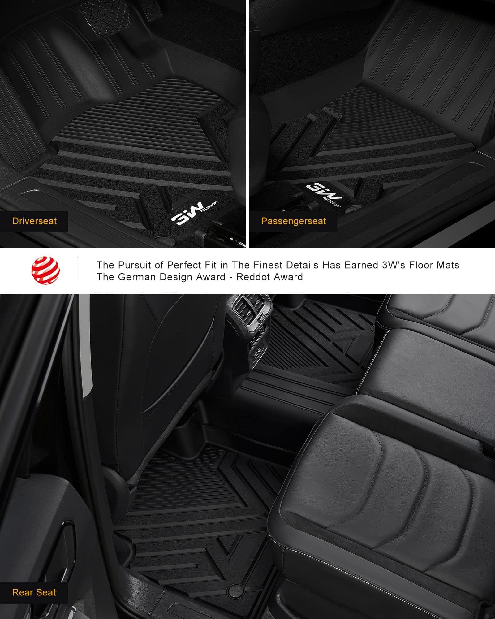 Material TPE: Los tapetes de automóvil 3W están hechos de elastómeros termoplásticos, que muestran ventajas tanto de materiales de caucho como de plástico, teniendo más fuerza, resistencia, durabilidad y elasticidad. Tiene propiedades térmicas sobresalientes y estabilidad de material cuando está expuesto a una temperatura extrema. El forro de maletero 3W no tiene olor ni siquiera en un clima extremadamente caluroso con todas las ventanas del automóvil cerradas, y puede mantenerse elástico en climas extremadamente fríos. Algunos chupetes para bebés están hechos del mismo material. Este diseño ganó el premio Red Dot 2017 en Alemania.