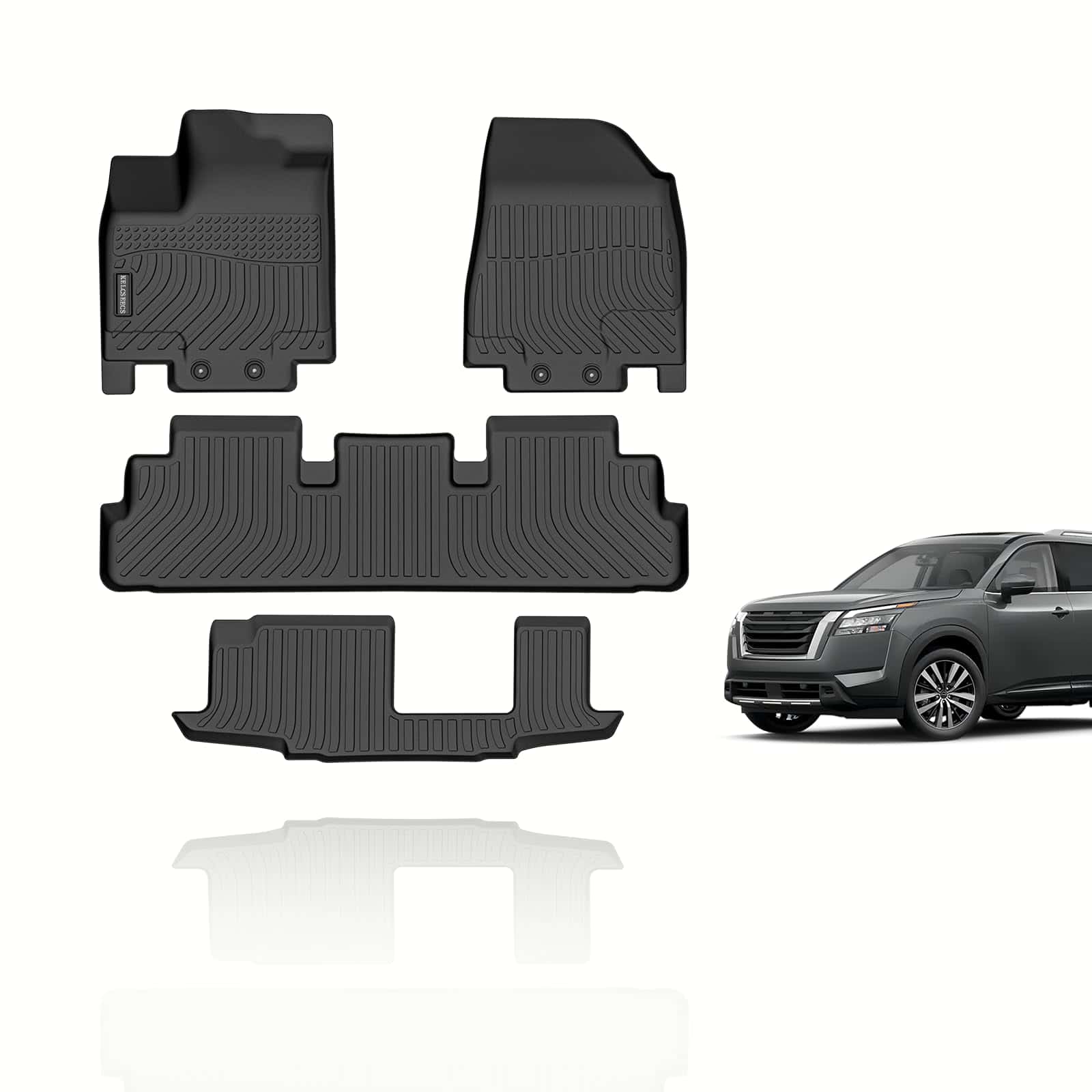 Tapetes a medida KELCSEECS para Nissan Pathfinder 8 Pasajeros 2022-2024/Infiniti QX60 7 Pasajeros. Tecnología de escaneo láser 3D para mostrar con precisión el tamaño original del auto, diseño con labio reforzado para prevenir derrames, bordes ajustados y fijados con hebilla, protección total para todas las temporadas con canales y bordes elevados que previenen la entrada de polvo, suciedad, sal, lluvia y nieve, ambiente y zapatos limpios. Material TPE ambientalmente seguro y duradero que mejora la resistencia al desgaste y mantiene la elasticidad estable en ambientes adversos. Diseño antideslizante que no interfiere con los pedales y garantiza la seguridad al conducir. Fácil de limpiar, resistente al agua y a las manchas, superficie antideslizante fácil de limpiar, protege el ambiente dentro del auto. Servicio post-venta profesional de KELCSEECS para proporcionar protección total para tu auto. Compromiso de brindar la mejor experiencia de compra a los compradores, contacto para resolver cualquier problema en 24 horas.