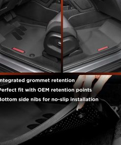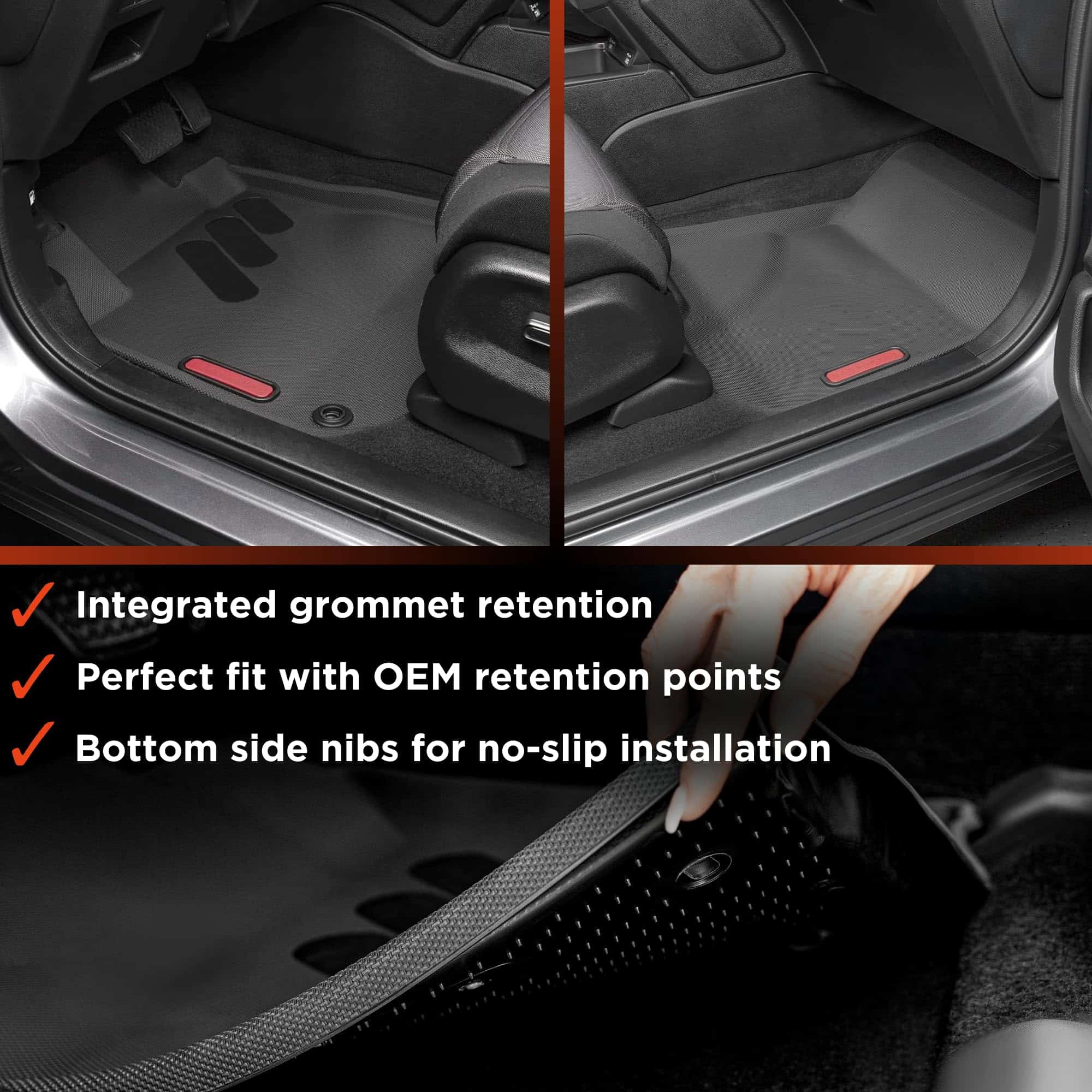 Safety is a top priority with the quick and easy installation process, with no tools required. The mats lock to factory retention features and the precise fit and nib features on the bottom surface prevent any movement once installed.